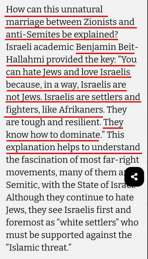 Here is the best explanation from an Israeli academic (Benjamin Beit-Hallahmi) to why the fascists far-right in Europe and America love Israel: