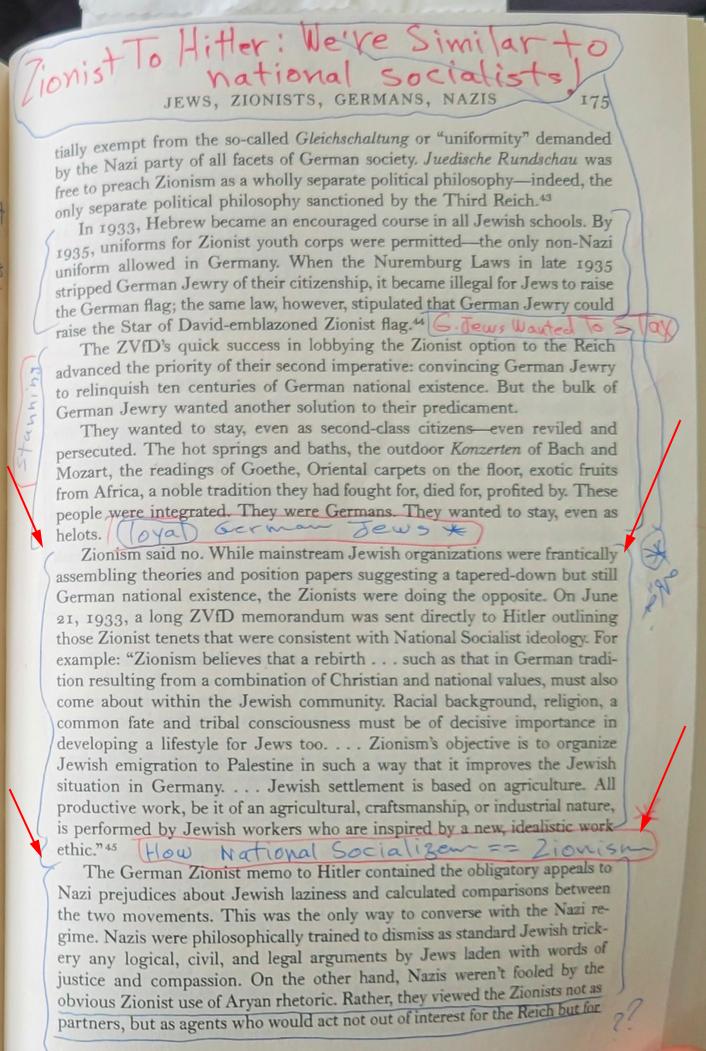 In the following page (scanned from renowned Zionist Edwin Black's "The Transfer Agreement", p. 175) please pay attention to how Zionist leaders, in the early 1933, went out of their to emphasize to Nazis that Zionism equals Nazism. Meaning: hay guys, we are like you! Birds of a feather flock together: