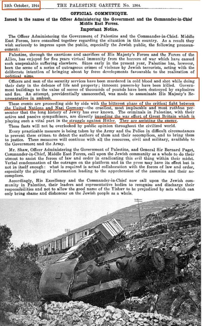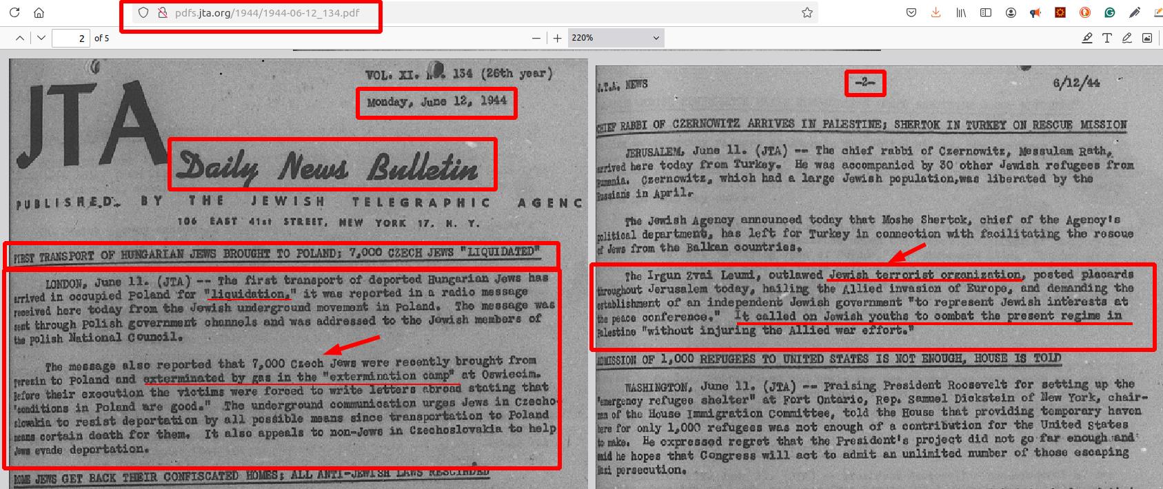 Here is the ultimate display of fake valor. This real-time June 12th, 1944 JTA report detailed on page 1 (on the left) how Nazis were gassing Jews in Poland, and at the same time on page 2 (on the right), Menachem Begin's Irgun Jewish terror group was bombing the WWII war efforts. YES, ladies and gentlemen. Two of Israel's future PMs (Yitzhak Shamir included of the Stern gang) were terrorizing the same people who were actively fight the Nazis and bombing WWII war efforts between 1939 until 1948. Note how the Irgun shamelessly was calling on the Gentiles to defeat the Nazis, while the so-called yishuvavoided fighting the Nazis to the bitter end! How different were they compared to the worst KAPOs in the death camps?