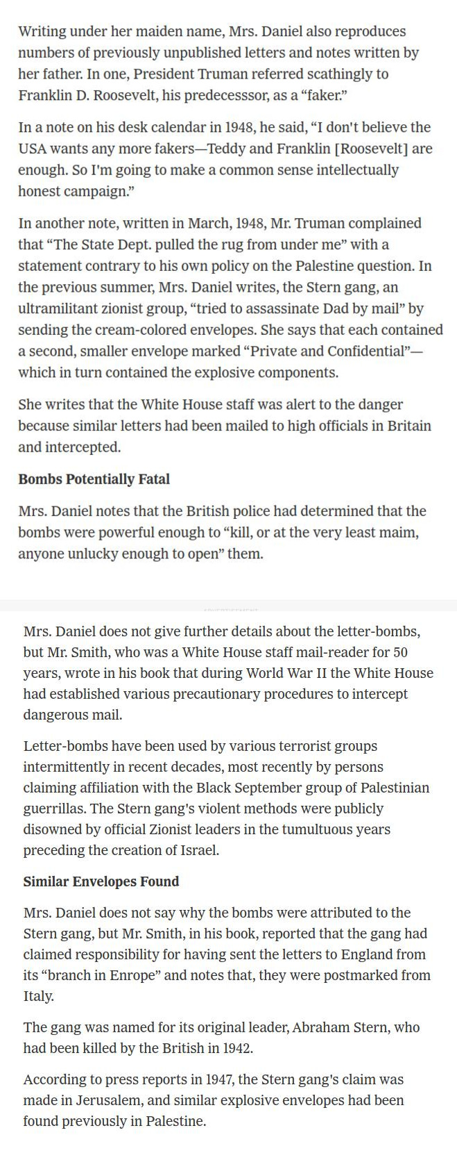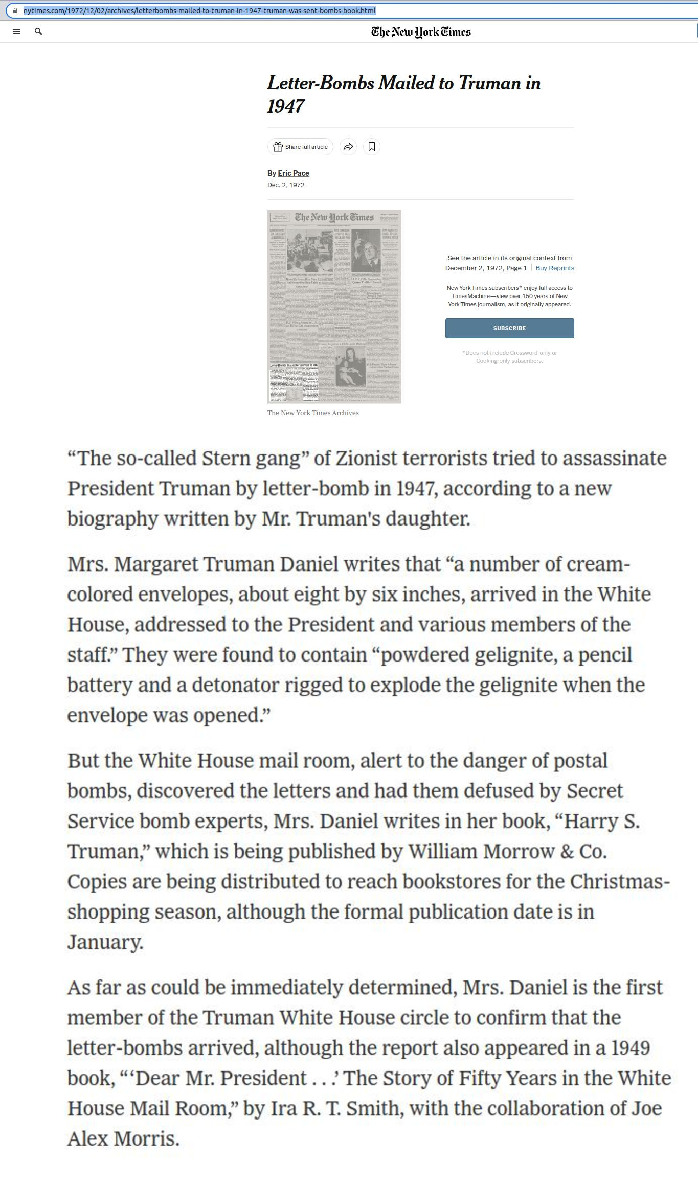 In 1947, it appears that the future Israeli PM, Yitzhak Shamir & Co., were plotting to murder President Truman. If this plot wasn't published the NY Times, we wouldn't have published it: