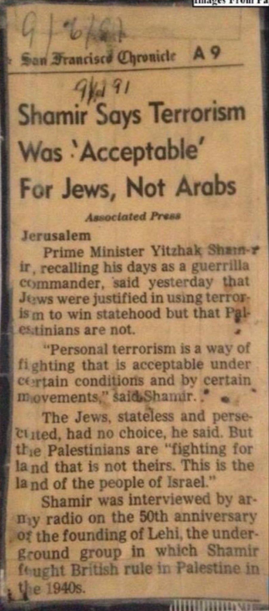 Here is Yizhak Shamir on terrorism; it is OK when Jews do it; but not for Palestinians: