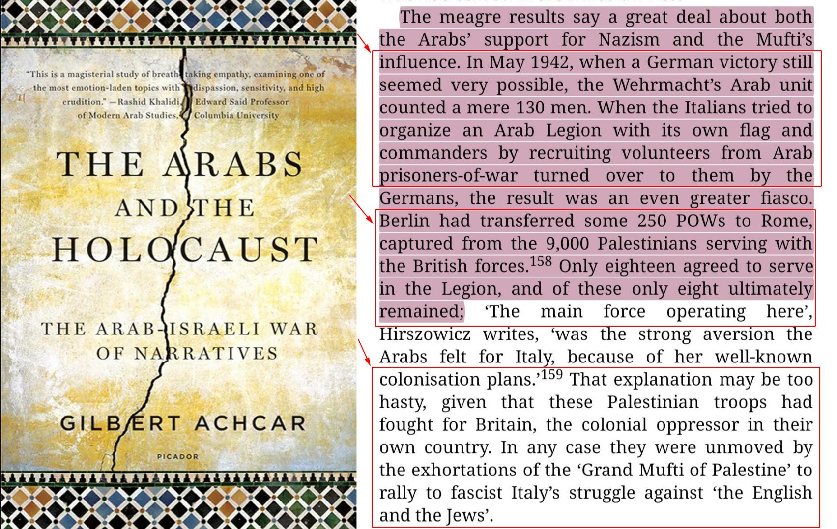 Gilbert Achkar examined primary German and Italian sources; Mr. Achkar found only 130 Arabs served in the Axis armies. Most importantly, of those, ONLY 18 were Palestinian (yes, 18 out of the 250 taken as POWs in North Africa) served in the German Army. Mr. Achkar's finding is in complete sync with Benny Morris' finding (who is a renowned hard-core Zionist) as well; Arabs and Palestinians didn't heed Mufti's call for Jihad. In a nutshell, Zionist Jews and their supporters portrayed Palestinians as Nazis because of the action of few. Ladies and gentlemen, this is propaganda on steroids: :