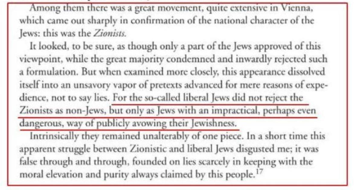 Here are excerpts of what Adolf Hitler thought of Zionism in his book Mein Kampf. Please pay attention to A)how Hitler emphasized that Europe's Jews rejected this Jewish Nationalist ideology two decades before their destruction during WWII, which explains why German Jews looked upon Zionists as enemies from within. Also, note B) how Hitler (the father of antisemitism) knew well the differences between Jews and Zionists and how he went out of his way not to conflate both. The same logic applies to most European antisemites, especially to the notorious antisemite, Winston Churchill, who blamed German Jews for their plight as late as Sept 1937! C) Zionists and Nazis were fond of each other, which explains why did Hitler favor Zionists in the 1930s, and why did both sides avoid clashing with each other during WWII! D) Hitler's version of "the Jews" seems to be in sync with Alan Dershowitz's version of "the Jew". These facts also explain why you could rarely find Nazis who were either anti-Zionists or who weren't pro-Zionists! Sadly, Nahum Sokolow's infamous prophecy (who headed the World Zionist Organization in the early 1930s) has become a reality, and nowadays, diaspora Jews have become mostly Zionists, although they did vote with their feet after WWII, and immigrated to the Americas (not Palestine) to live with the Gentiles. That is a fact which continues to this date, although Palestine was emptied of its people! If you wish to read our take on the dangers of conflating Judaism with Zionism, please click here: Here is the source hosted on Google Books.