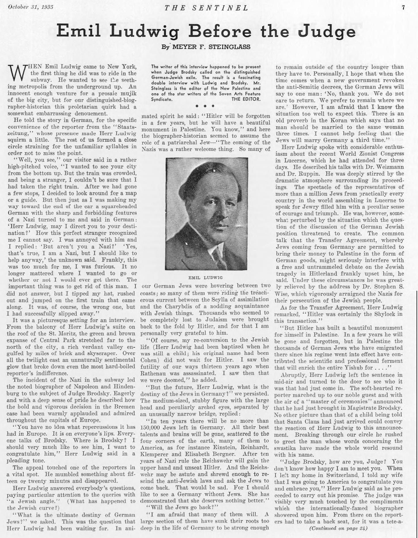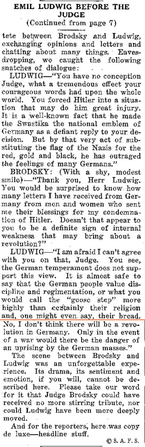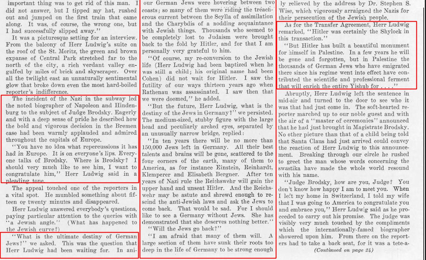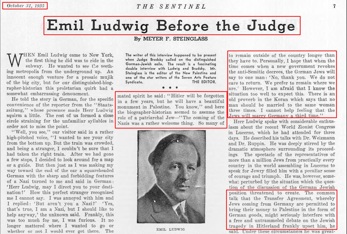 The article blow (which was published in The Sentinel on October 31st, 1935) exposes how Zionist Jewish intellectuals were fond of Nazism and fascism in the 1930s. What Emil Ludwig said below was common at the time in the Jewish press; many Zionist leaders and intellectuals foresaw the "benefits" of the rise fascism, antisemites, and Nazism; Theodor Herzl, Ze'ev Jabotinsky, David Ben-Gurion, and Nahum Sokolow were known to use very similar language. Mr. Ludwig (formerly Cohen before he changed his last name) was one of the most important German Jewish intellectuals who witnessed the rise of Hitler firsthand. Therefore, Emil must have known how dangerous Nazism was. Insanely, Mr. Ludwig saw nothing but an upside for Nazism, as if he was asking Hitler to double down on his fascism and antisemitism! Although Mr. Ludwig spoke passionately on behalf of Zionism, he voted with his feet (as most European Jewry) and made Aliyah TWICE to Switzerland and the US, but not to Palestine! On a different note, please note in the first column, how Mr. Ludwig referred to the case of the SS Bremen and to Judge Louis Brodsky concerning the case of the American Gentiles in New York City who tore the Nazi flag off the German ship a few months earlier. Pay attention to how there was no citation of that fact that it was Zionist Jews who proudly hoisted Swastikas on their Palestine-registered Haavara fleet just a few months earlier. Below the article, you'll find the rest of our analysis continues. The Sentinel on October 31st, 1935