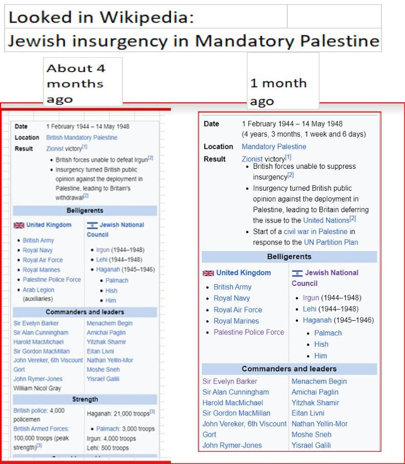 Here is an excellent example of how the Ministry of Truth (a.k.a. the Ministry of Hasbarah) functions. Zionist Jews' fake valor during WWII has been framed by Jewish so-called historians as an "insurgency". Yes, not an insurgency against the Nazis (who were murdering their families in the millions), but against the British who underwrote Zionism from the start. YES, against the same British who protected the so-called yishuv from Nazis' march from North Africa in 1942! We hate to keep emphasizing to the readers that it was Zionist Jews who bombed WWII war efforts while their families were being gassed in Poland; not by the British but by the Nazis. That said, to Wikipedia's editors and Jewish so-called "historians" (e.g., see how Benny Morris framed Zionists' fake valor), that was an "insurgency" by the "indigenous people" seeking independence on the lands they "already owned"! Ladies and gentlemen, this is Hasbarah on steroids: