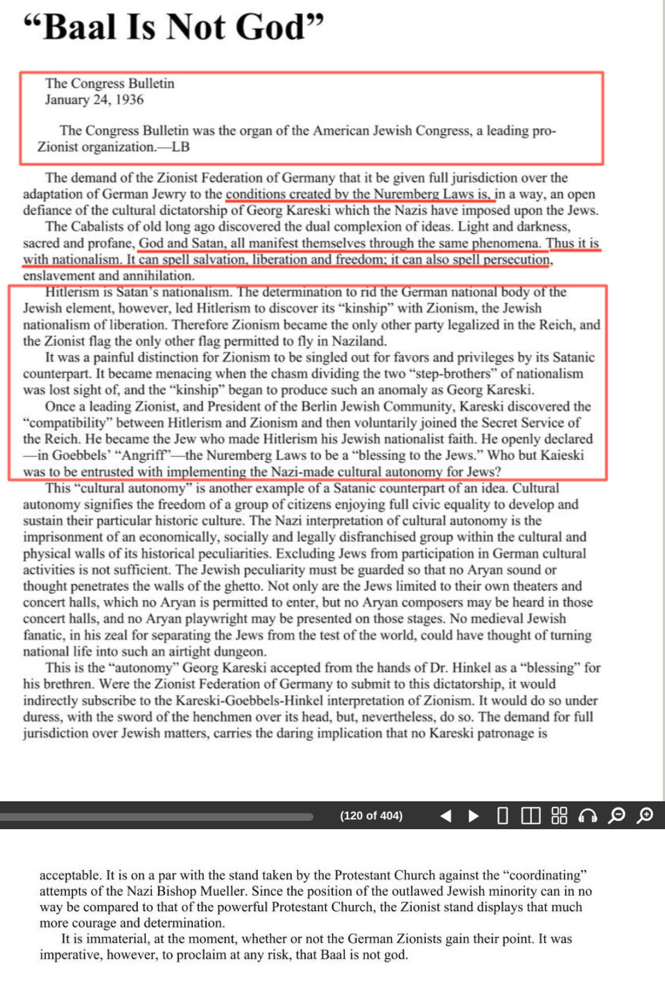 Here is the infamous article, Baal Is Not God, which was written by American Zionists in early 1936 (a few months after the Nuremberg Laws were enacted) who were led by the notorious antisemite, Rabbi S. Stephen Wise, who lobbied against rescuing Europe's Jews before, during, and after WWII except for Palestine: