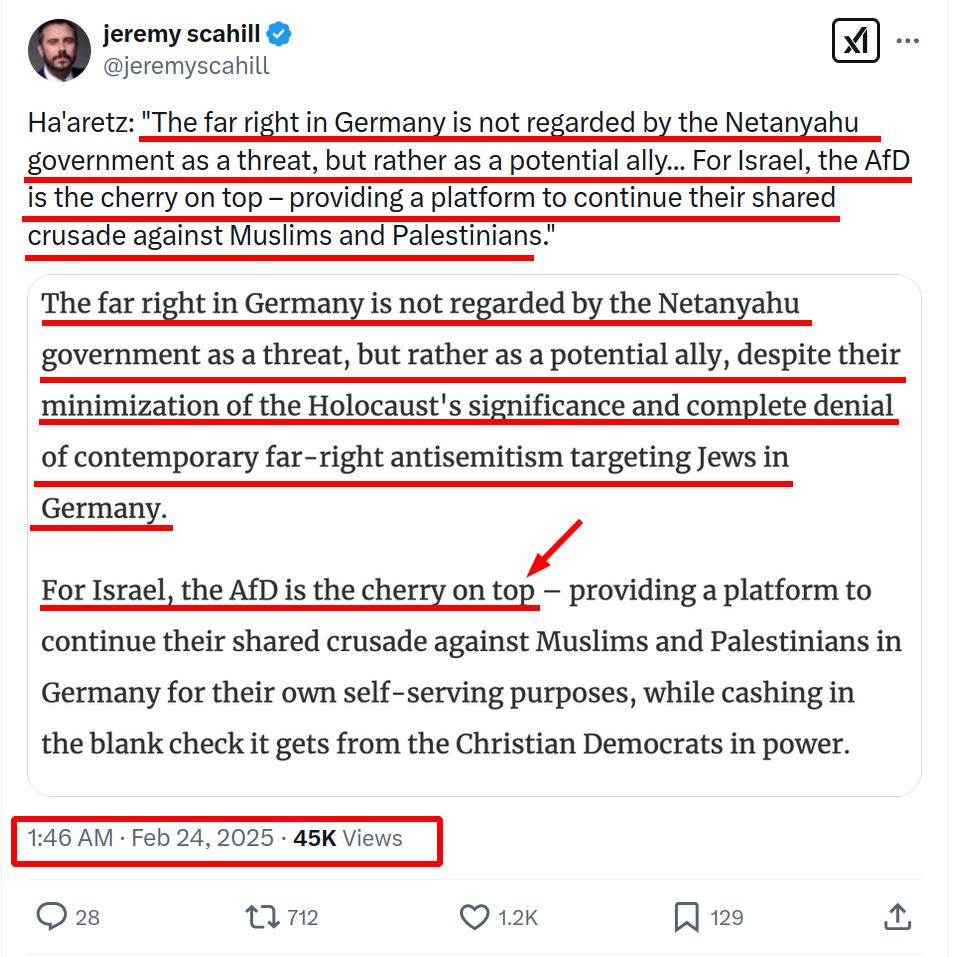 Please watch Michael Barenboim the for two minutes (a Jewish German who heads the Chamber Music at the Barenboim-Said Academy in Berlin) explains how Germany's pro-Israel policy is misguided since Germany has been trying since the end of WWII to mask one crime (the Holocaust) by masking other ones against Palestinians; which he doesn't subscribe for: