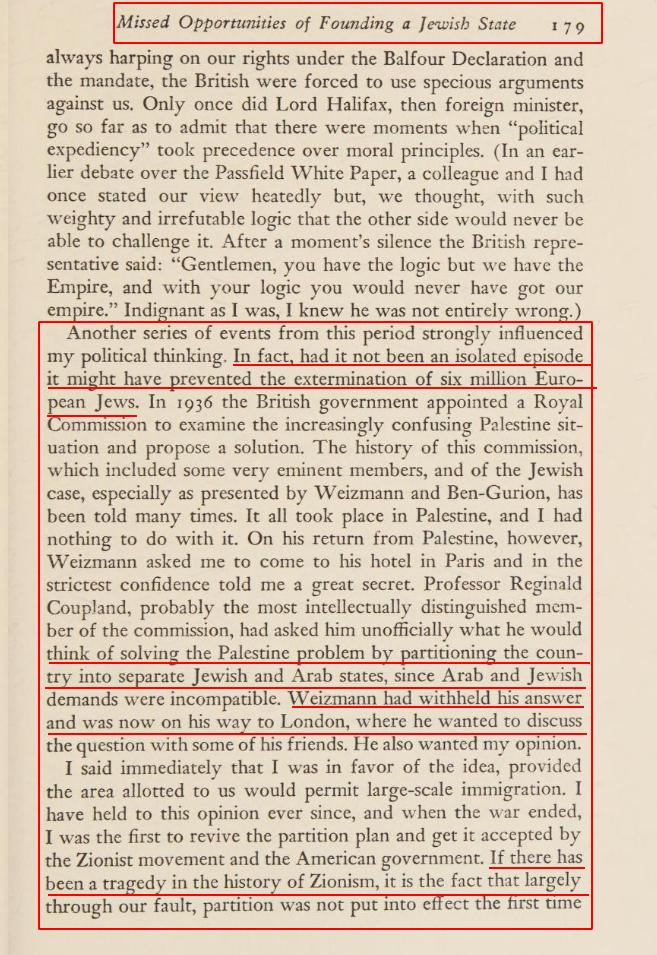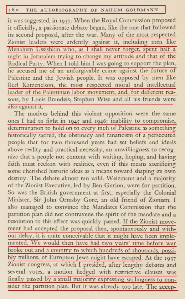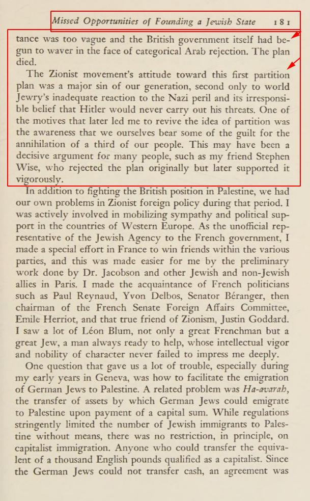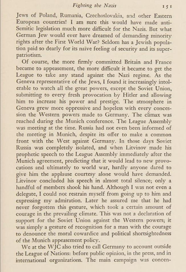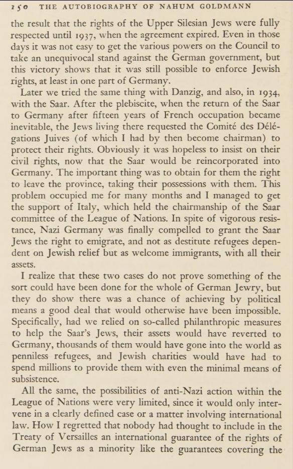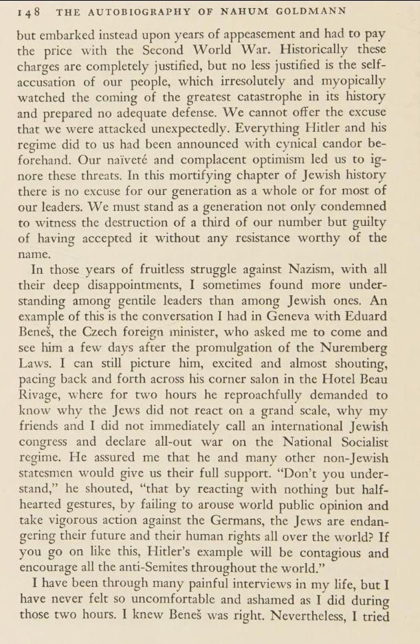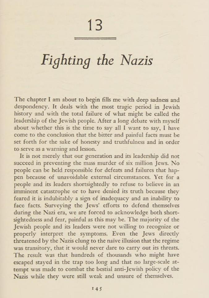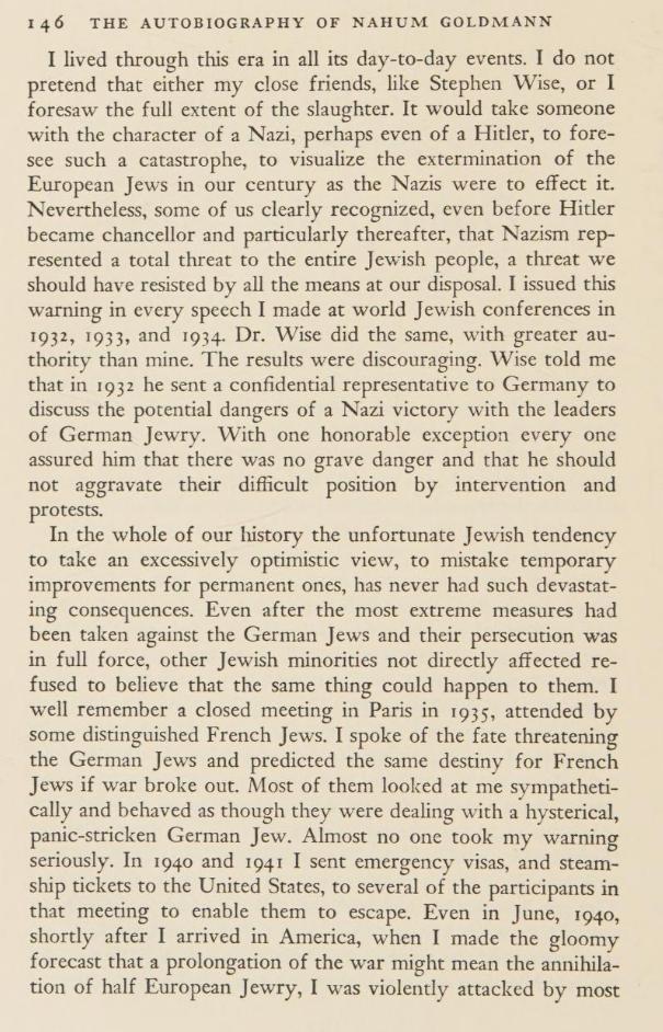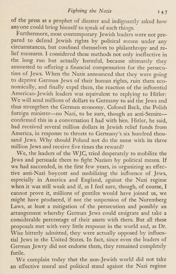 In the following pages, Nahum Goldmann (one of the most important founding fathers of the Jewish state who witnessed the rise Nazism firsthand) looks back on the events that happened in the 1930s and 40s with great regrets and deep remorse. Mr. Goldmann kept repeating over and over how Jews (Zionists and non-Zionists alike) were passive in confronting fascism (especially after the Nuremberg Laws were enacted), how boycotting Nazis should have been encouraged, and how Jews were reluctant to confront Nazism from day one, which is mainly true except for Marxist Jews. Ironically, it was the founder of Zionism, Theodor Herzl, who taught Zionists to appease antisemites whom he predicted would become Zionists' best friends! That said, when you examine what Mr. Goldmann wrote, you'll find ZERO references to the infamous Haavara Agreement, which lasted for nine years straight (with ZERO interruptions, even after Kristallnacht). Haavara was allowed to continue for this long because it was good for Zionism, and not for Haavara, Zionist enterprises (i.e., the Jewish Agency, JNF, ..etc) would have been liquidated. Also, it should be noted that it was Mr. Goldmann (and his close friend Rabbi Stephen Wise at the WJC) who lobbied against any haven for Europe's Jews EXCEPT for Palestine; this is an open secret in the American Jewish community. The omission of these relevant facts is VERY revealing, especially when it was Zionist Jews in mass who were AGAINST boycotting Nazis and who helped Hitler to break up the anti-Nazi boycott. Actually, David Ben-Gurion & Co. at the Jewish Agency banned anti-Nazi protests too. What was tragically funny was this Chapter's title (Fighting the Nazis) when it was Zionist Jews who went out of their way to avoid fighting the Nazis to the bitter end!