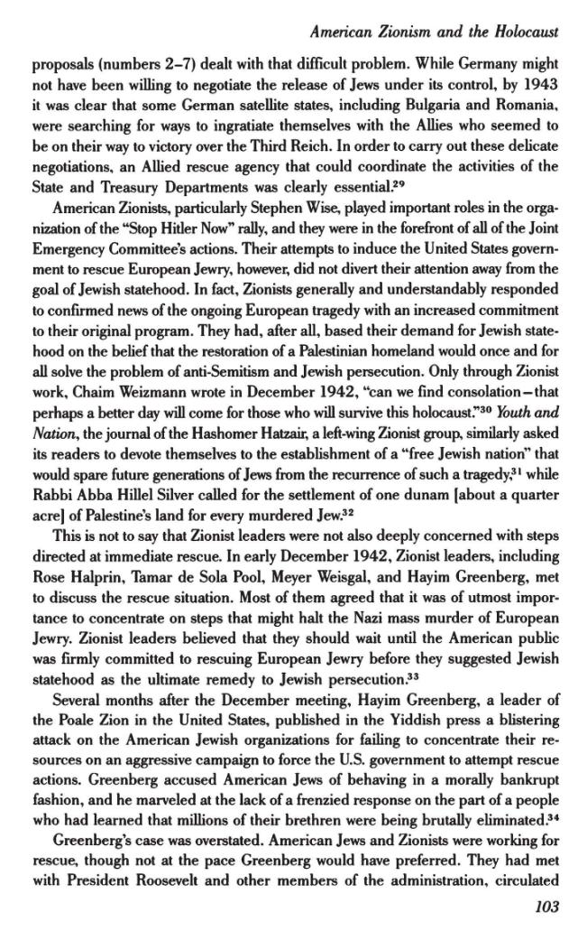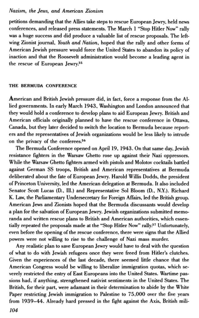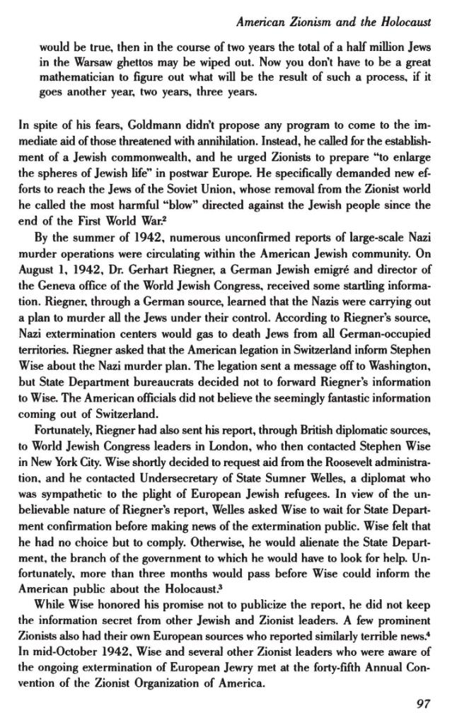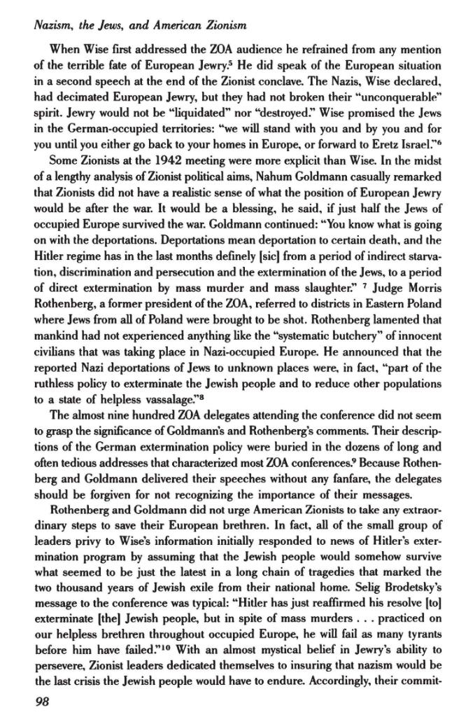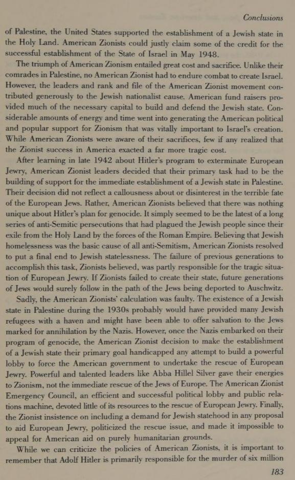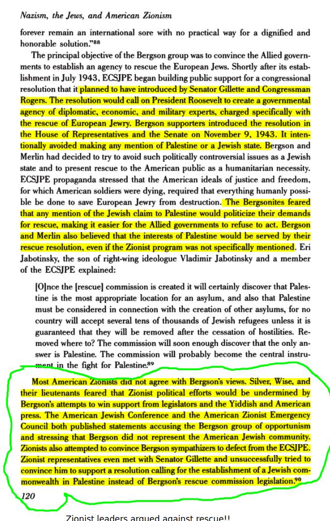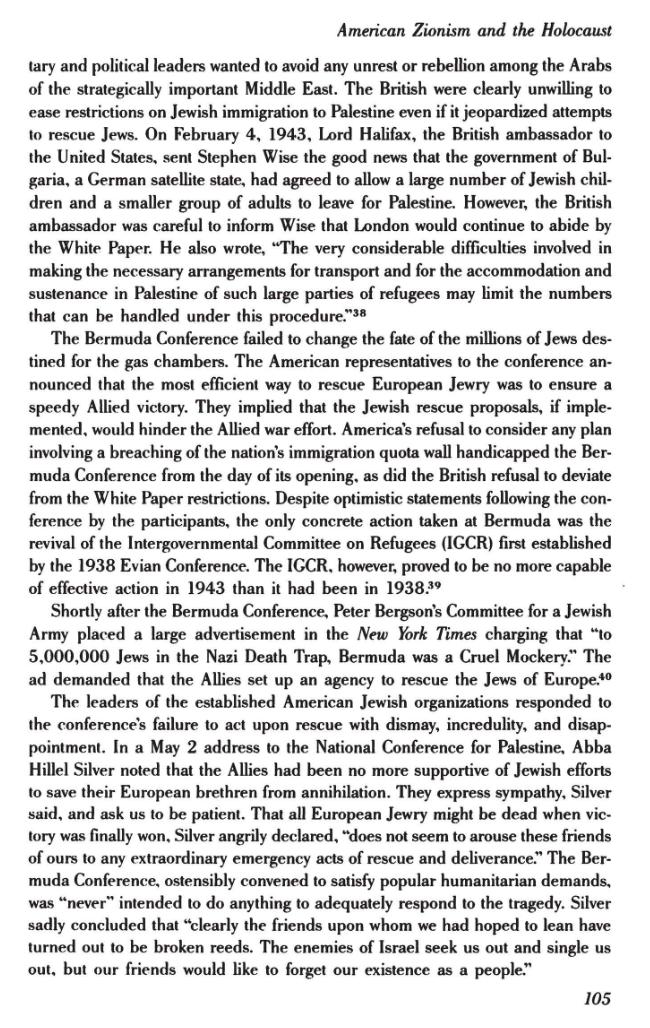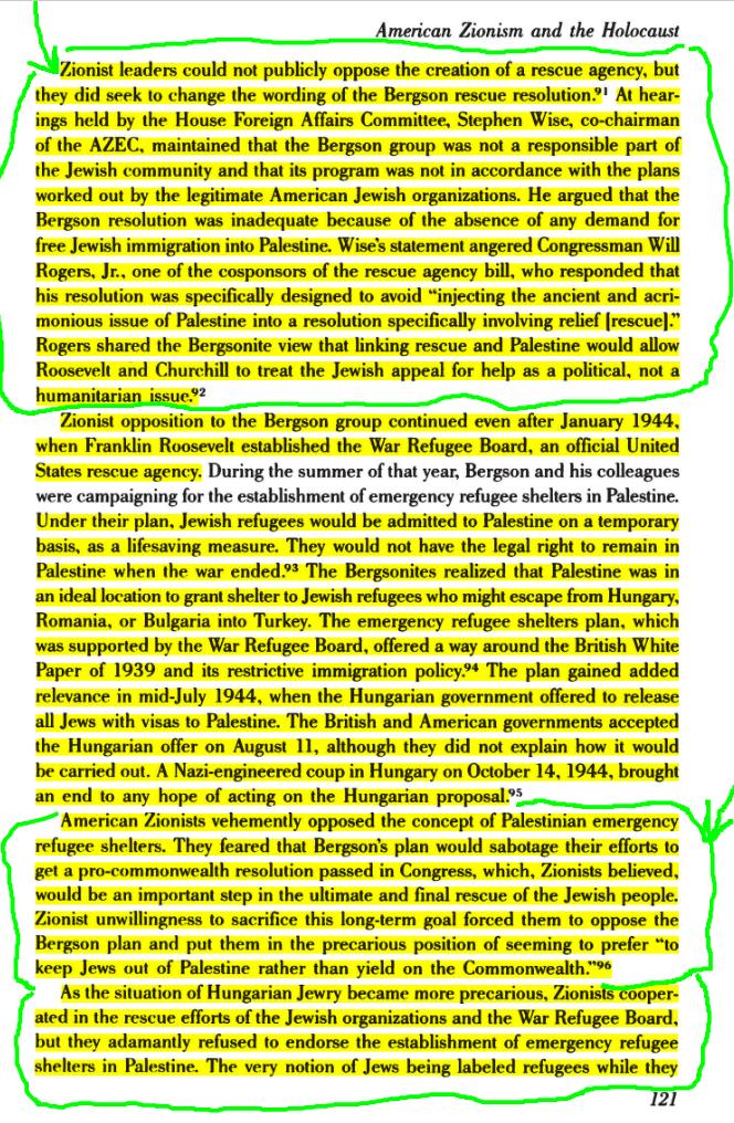 - Pay attention to how the author, Aaron Berman, blamed FDR and Churchill for the Holocaust, but he gave a free pass to his Zionist buddies. Why blame the Gentiles when American Jewry was passive in the best-case scenario? Notice how Mr. Berman, too, was fixated on Palestine as the only haven for Europe's Jews but ignored that they could have been saved in other places. For example, in his country, the United States, or in Latin and South America, where tens of thousands were saved. Most importantly, Mr. Berman said nothing about FDR's War Refugee Board which saved hundreds of thousands of Jews; this happened while American Jewish leaders were lobbying against it! It should be noted that this policy persisted even after WWII ended in the DP camps, which he completely ignored in his book. If Mr. Berman did, most likely he would have been canceled, like what happened to Hannah Arendt in 1963. For those who care, American Jews investigated many of the points we have highlighted in 1983, and they were nixed: