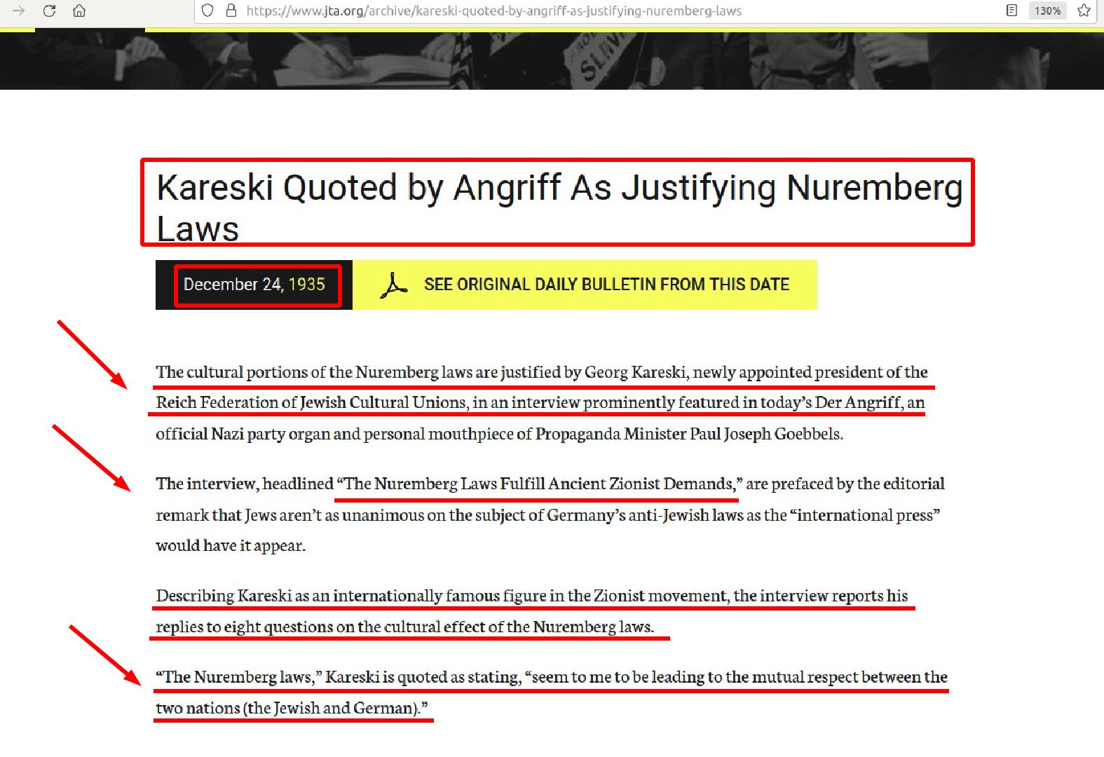 Here is Georg Kareski's response to Nuremberg Race Laws by JTA in Dec 1935:
