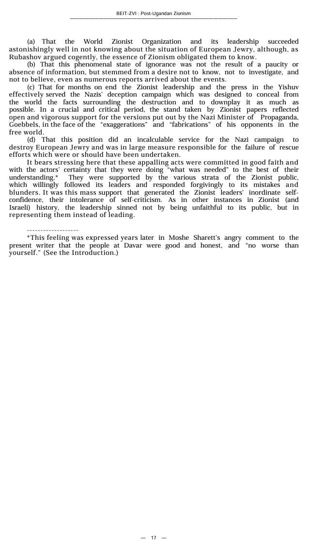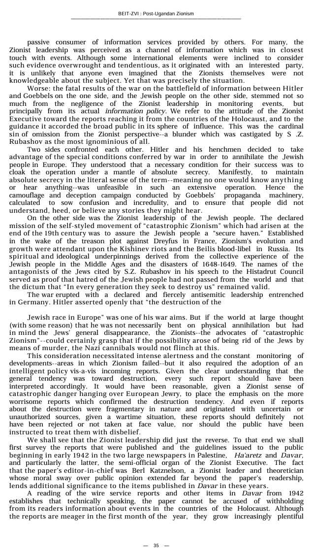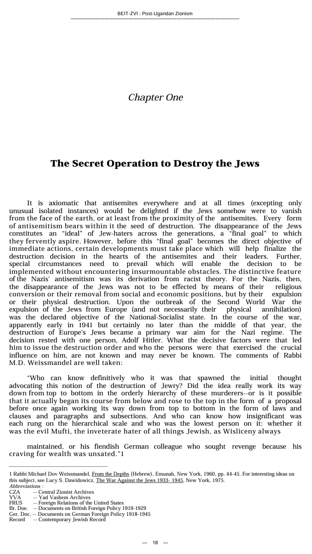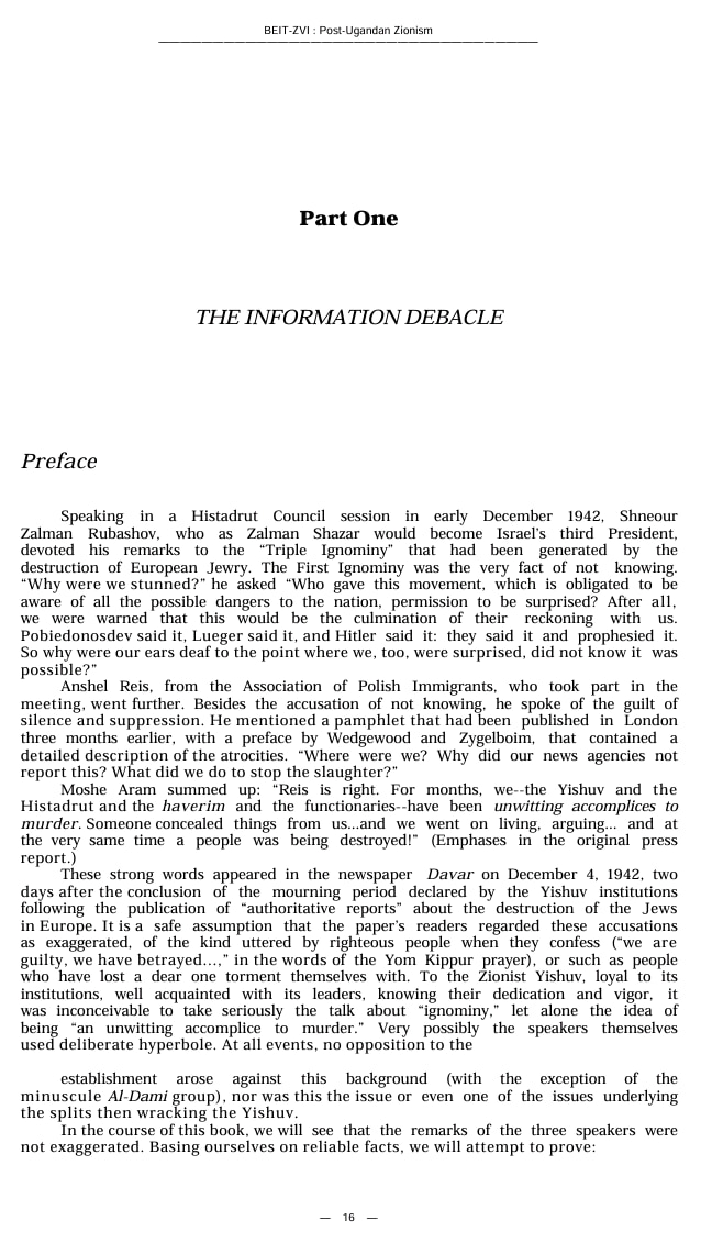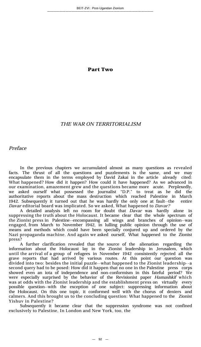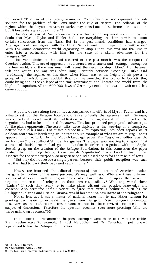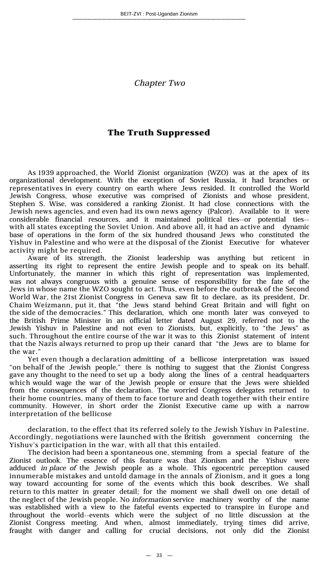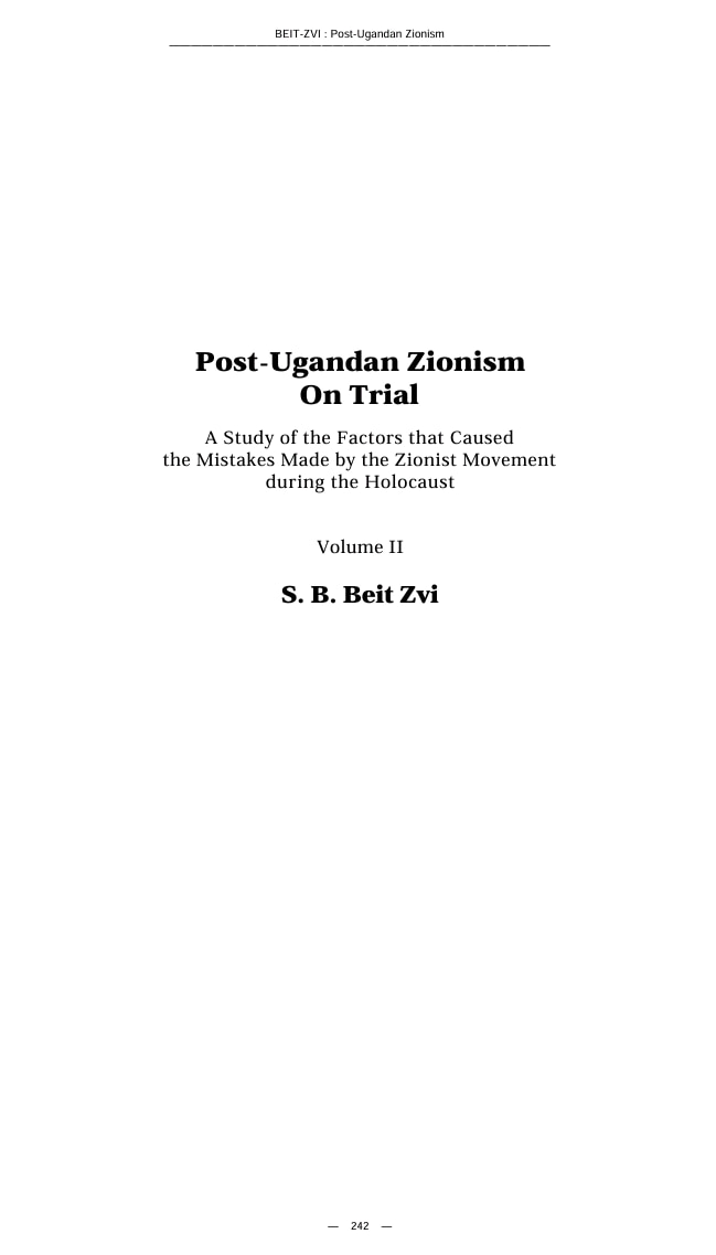 As we were researching the Haavara Agreement and Zionists' response to the Holocaust, this excellent book kept coming up as a resource. Although the author, Beit Zvi, was not trained as a historian, his research and analysis are top-notch. This book was one of the first to be released on the subject of Zionists' response to the Holocaust (the Hebrew version was first released in 1977, and this English version was released in the early 1990s), and as you shall see, he even corresponded with David Ben-Gurion and other Zionist leaders, too. Before using his research, we spent a lot of time verifying the sources, and honestly, Zvi's is top quality. Anyhow, we hope you enjoy this format, here is the same version but in PDF format.