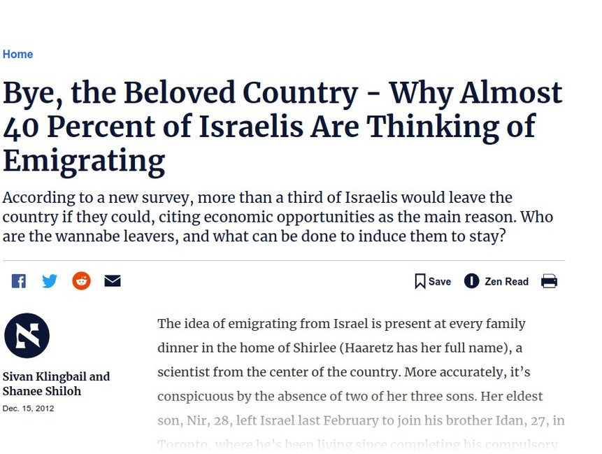 Isn't it odd how almost every other American and Canadian Jew at least visited Israel once, but only a few of them made it their home (under 1%)? Even those who did aliyah from the US and Canada, they were mostly made up of retirees with a home in Tel Aviv and another in NY City or Toronto! For the love of God, even during peacetime, a sizable minority of Israelis would leave if the opportunity arises although Israel has the one of the highest income per capita in the world! In this regard, remind us guys who is indigenous and connected to the land, or it is )))antisemitic((( to even ask the obvious questions?