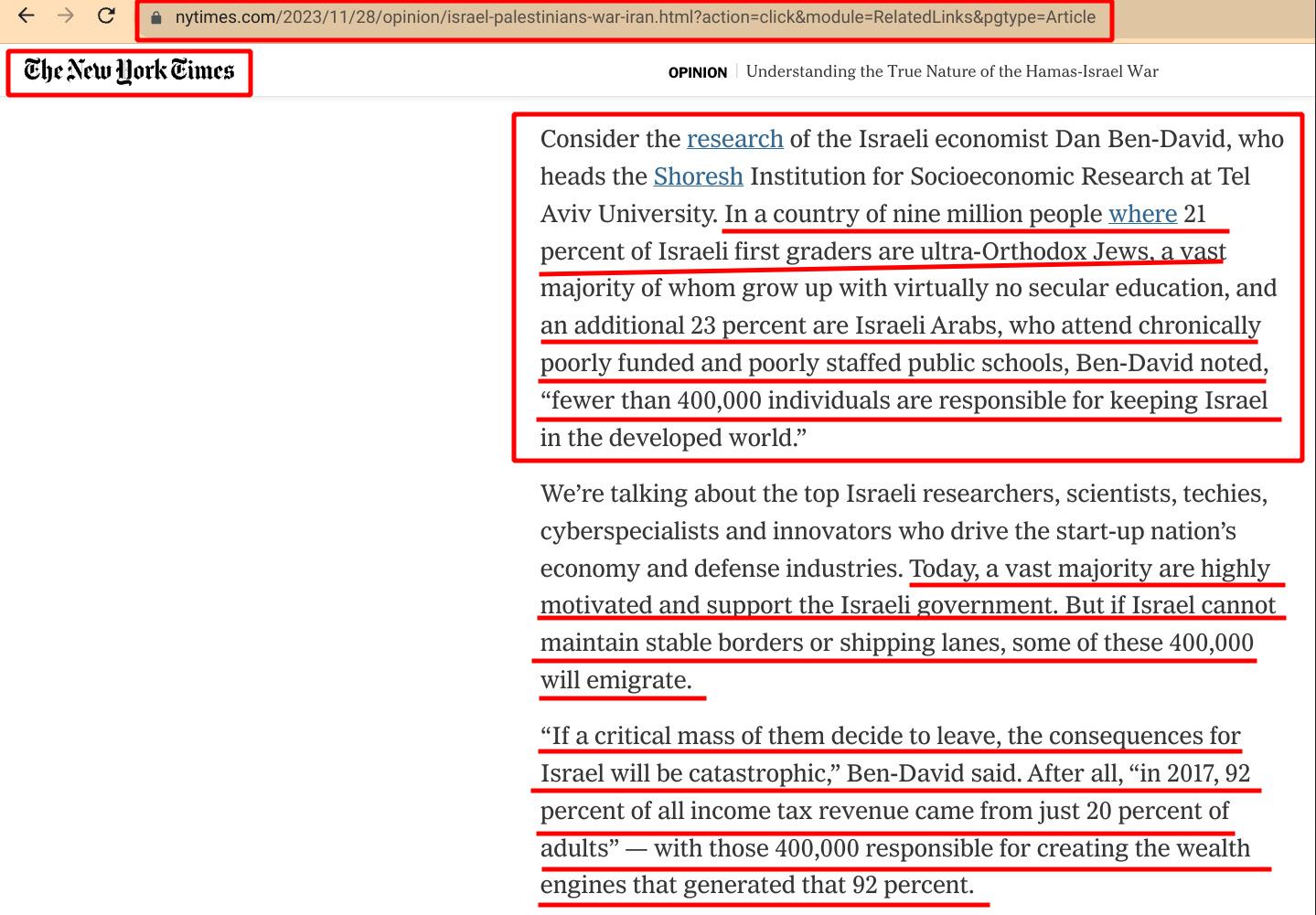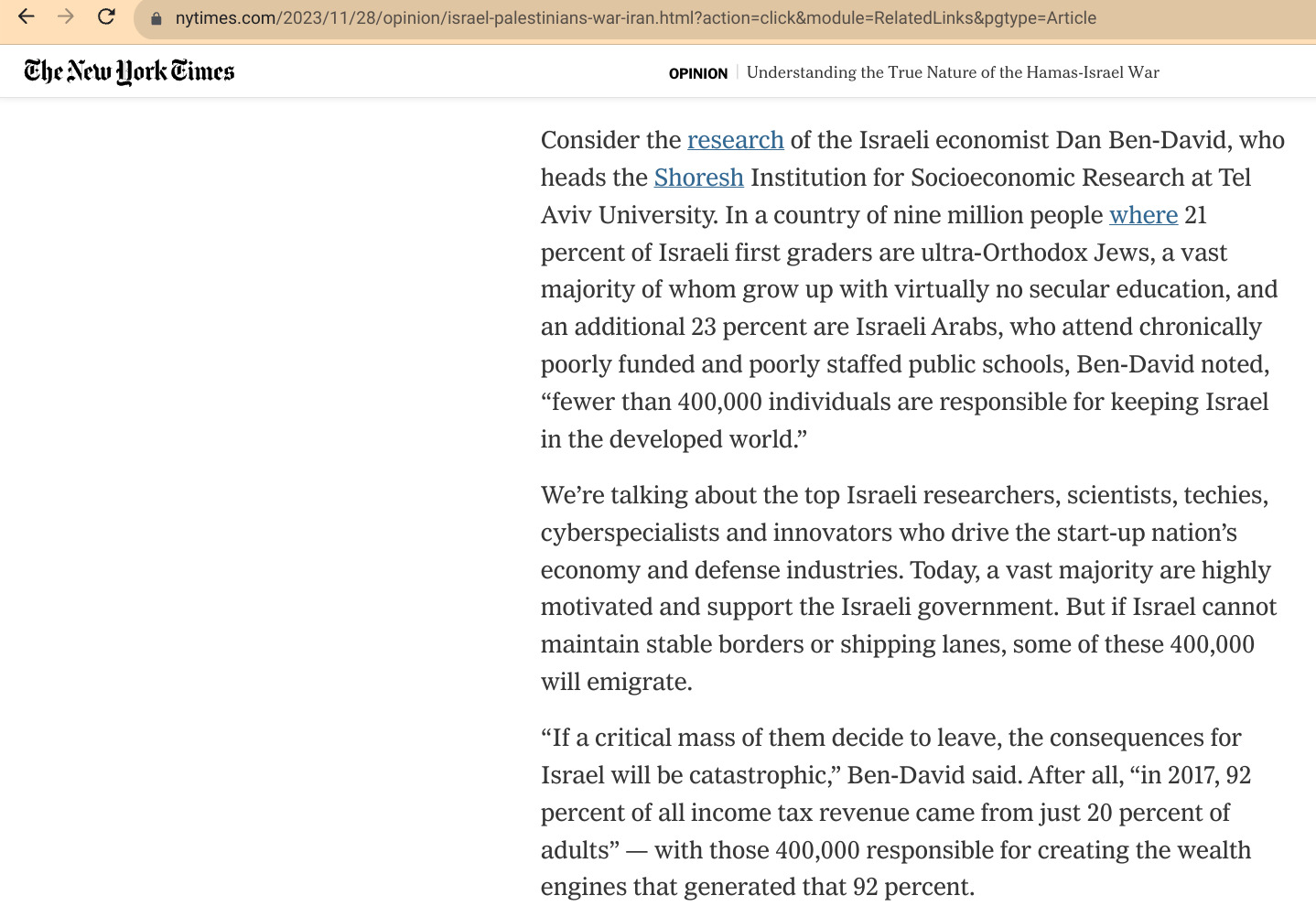 Here are a few statistics about the Israeli society (taken from Thomas Friedman's articles at the NY Times on Nov. 28th, 2023) exposing the fragility of this fascist state. Within the strength of the so-called "Jewish state" and its macho facade contains the seeds of its destruction (no genocide is needed; the state will come down under its own weight), and the below statistics are only handful of them. The October 7th Raid exposed several others, here are a few of them: just imagine a simple oil or gas embargo, or a moderate size boycott; how many Israelis would leave at the drop of a hat? Well, keep your fingers crossed; inshallah soon: