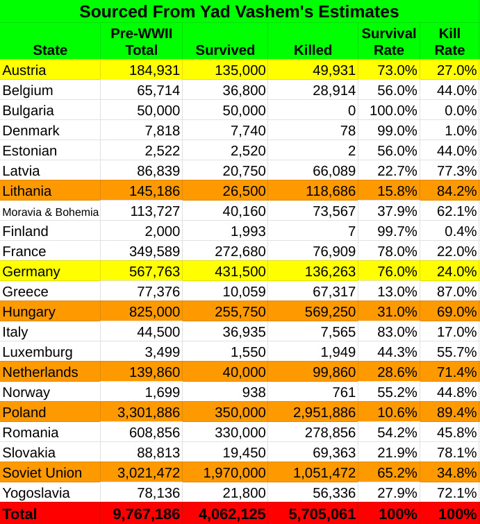 Here is a detailed tally of the number of Jews who were killed vs. those who survived the Holocaust, broken up by country sourced from Yad Vashem. As you contemplate the below table, please note A) how the vast majority of Europe's Jews preferred to live with the Gentiles even after Palestine was emptied of its indigenous people. As we shall prove soon, this phenomenon persists to this date. B) Majority of the Jewish refugees (who lingered in the DP camps for years after WWII ended) would not have gone to Palestine if Zionist leaders hadn't lobbied with their teeth and nails against any haven except for Palestine. It should be noted that European Jewry's reluctance to do Aliyah was the driving force behind airlifting Arab Jews in a hurry directly from their homes to Palestine soon after Nakba (see the One Million Plan for details). Arab Jews weren't on Zionists' minds until they knew for sure that European Jewry wouldn't be doing aliyah for one reason or another. C) Note the high survival rate among the German and Austrian Jewish communities (along with a few others like Bulgaria) who were by far the luckiest. Most of those left just before Hitler closed Europe's exists in late 1941. Meaning, at least 75% of them survived the calamity. Actually, we strongly suspect that German and Austrian Jewry's survival rate is higher. After the Kristallnacht pogrom of late 1938, the mass majority of them started to leave left and right in unorganized fashion (many went to Mexico, Latin and South America). Thus, it was very hard to account for them and any estimate must have a large margin of error. In this regard, we have to ask: why did Holocaust historians frame the Evian Conference as if it was a big failure when the mass majority managed to leave within a three-year period? Our analysis continues below the image!