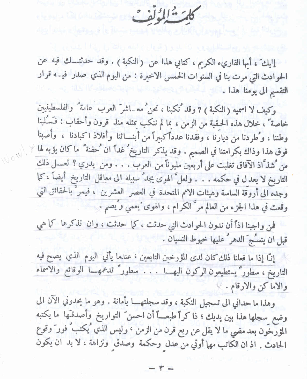 وهذا ما حداني إلى تسجيل النكبة ، وقد سجلتها بأمانة . وهو ما يحدوني الآن إلى وضع سجلها بين يديك ؛ ذاكرًا طبعًا أن أحسنَ التواريخ وأصدقَها ما يكتبه المؤرخون بعد مضي ما لا يقل عن ربع قرن من الزمن ، وليس الذي يُكتب فورَ وقوع الحادث . إذ إن الكاتب مهما أوتي من عدلٍ وحكمة وصدقٍ ونزاهة ، لا بد أن يكون