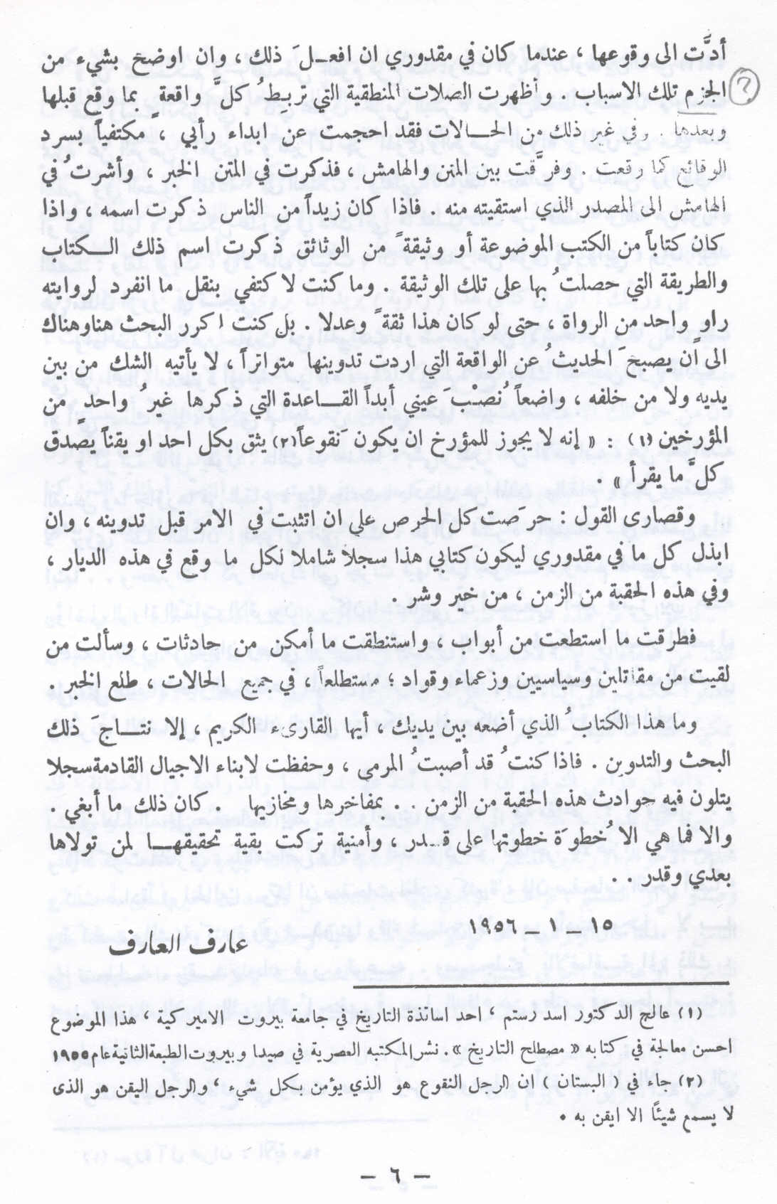 وما هذا الكتابُ الذي أضعه بين يديك ، أيها القارئ الكريم ، إلا نتاج ذلك البحث والتدوين . فإذا كنتُ قد أصبتُ المرمى ، وحفظت لأبناء الأجيال القادمة سجلا يتلون فيه حوادث هذه الحقبة من الزمن .. بمفاخرها ومخازيها .. كان ذلك ما أبغي . وإلا فما هي إلا خُطوَة خطوتها على قدر ، وأمنية تركت بقية تحقيقها لمن تولاها بعدي وقدر ..