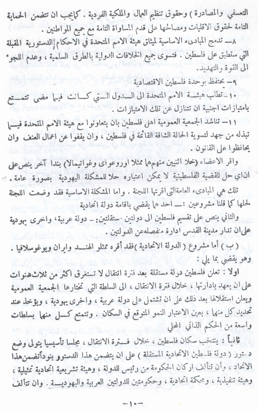 ثانيا : ينتخب سكان فلسطين ، خلال فترة الانتقال ، مجلسا تأسيسيا يتولى وضع دستور (دولة فلسطين الاتحادية المستقلة) على أن يتضمن هذا الدستور بنودا تضمن هذا الاتحاد ، وأن تتألف أركان الحكومة من رئيس للدولة ، وهيئة تشريعية اتحادية تمثيلية ، وهيئة تنفيذية ، ومحكمة اتحادية ، وحكومتين للدولتين العربية واليهودية . وأن تتألف