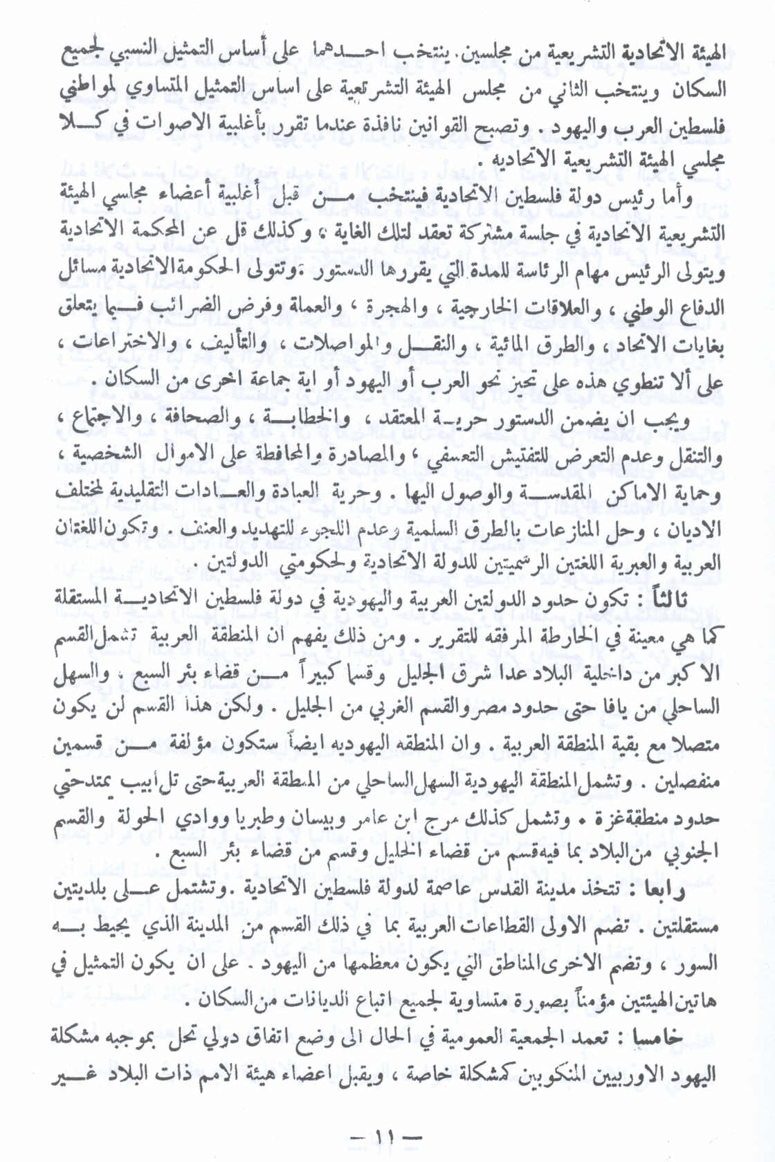 رابعا : تتخذ مدينة القدس عاصمة لدولة فلسطين الاتحادية . وتشتمل على بلديتين مستقلتين . تضم الأولى القطاعات العربية بما في ذلك القسم من المدينة الذي يحيط به السور ، وتضم الأخرى المناطق التي يكون معظمها من اليهود . على أن يكون التمثيل في هاتين الهيئتين مؤمنًا بصورة متساوية لجميع أتباع الديانات من السكان .