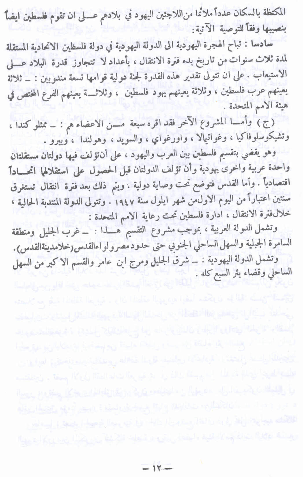 وهو يقضي بتقسيم فلسطين بين العرب واليهود ، على أن تؤلف فيها دولتان مستقلتان واحدة عربية وأخرى يهودية وأن تؤلف الدولتان قبل الحصول على استقلالهما اتحادًا اقتصاديًا . وأما القدس فتوضع تحت وصاية دولية . ويتم ذلك بعد فترة انتقال تستغرق سنتين اعتبارًا من اليوم الأول من شهر أيلول سنة 1947 . وتتولى الدولة المنتدبة الحالية ، خلال فترة الانتقال ، إدارة فلسطين تحت رعاية الأمم المتحدة :