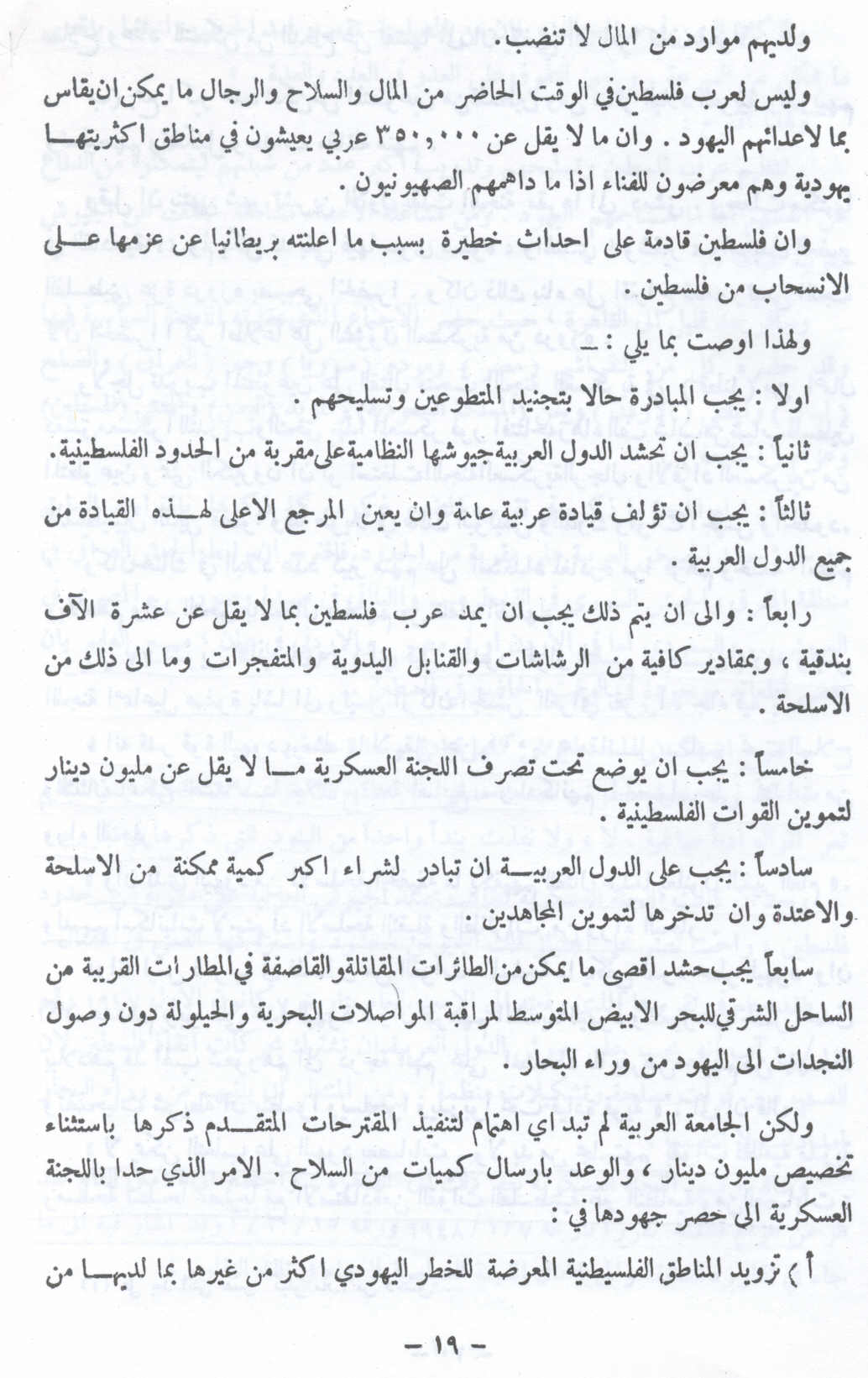 خامسًا : يجب أن يوضع تحت تصرف اللجنة العسكرية ما لا يقل عن مليون دينار لتموين القوات الفلسطينية .