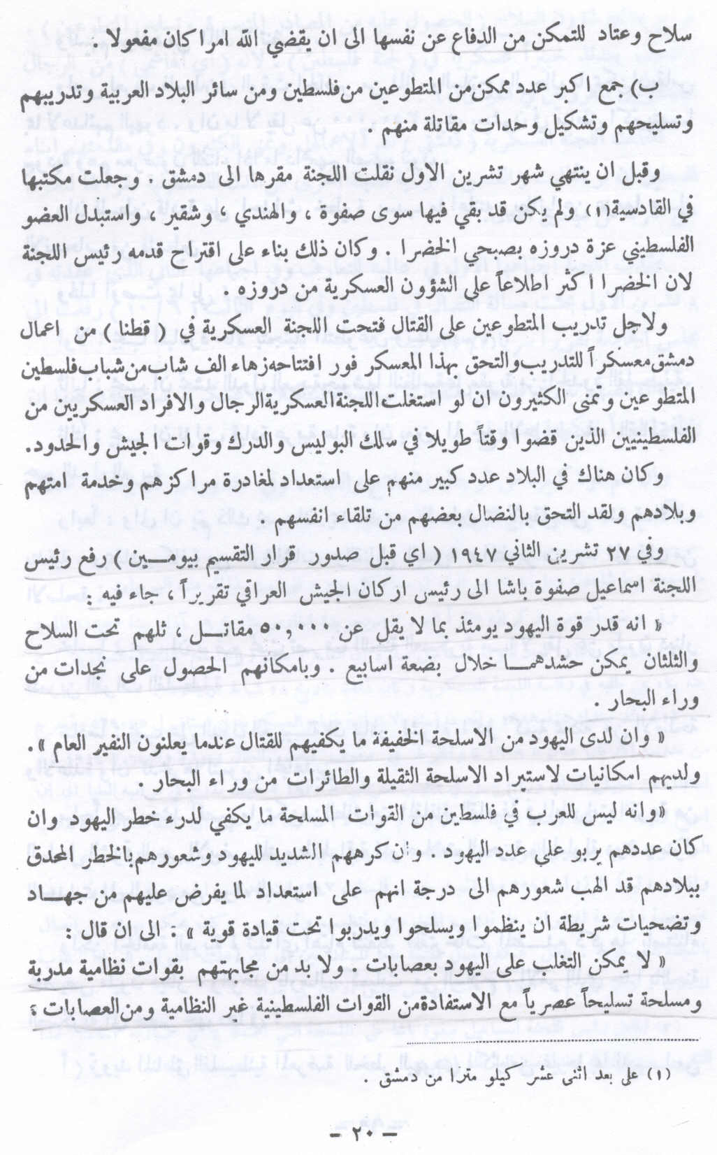 «وأنه ليس للعرب في فلسطين من القوات المسلحة ما يكفي لدرء خطر اليهود وإن كان عددهم يربو على عدد اليهود . وإن كرههم الشديد لليهود وشعورهم بالخطر المحدق ببلادهم قد ألهب شعورهم إلى درجة أنهم على استعداد لما يفرض عليهم من جهاد وتضحيات شريطة أن ينظموا ويسلحوا ويدربوا تحت قيادة قوية» . إلى أن قال :