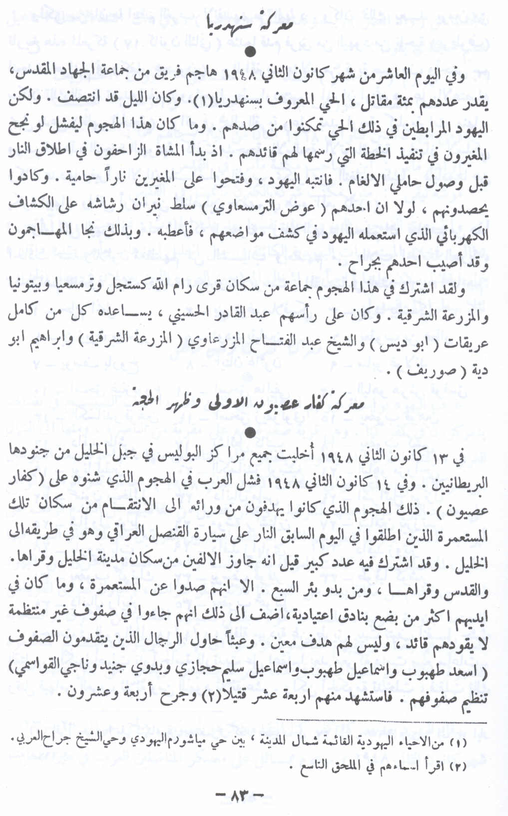 معركة سنهدريا - 10 كانون ثاني 1947 --معركة كفار عصيون الأولى وظهر الجعبة (أسفل الصورة) - 13 كانون ثاني 1947- النكبة الفلسطينية والفردوس المفقود للأستاذ عارف العارف |