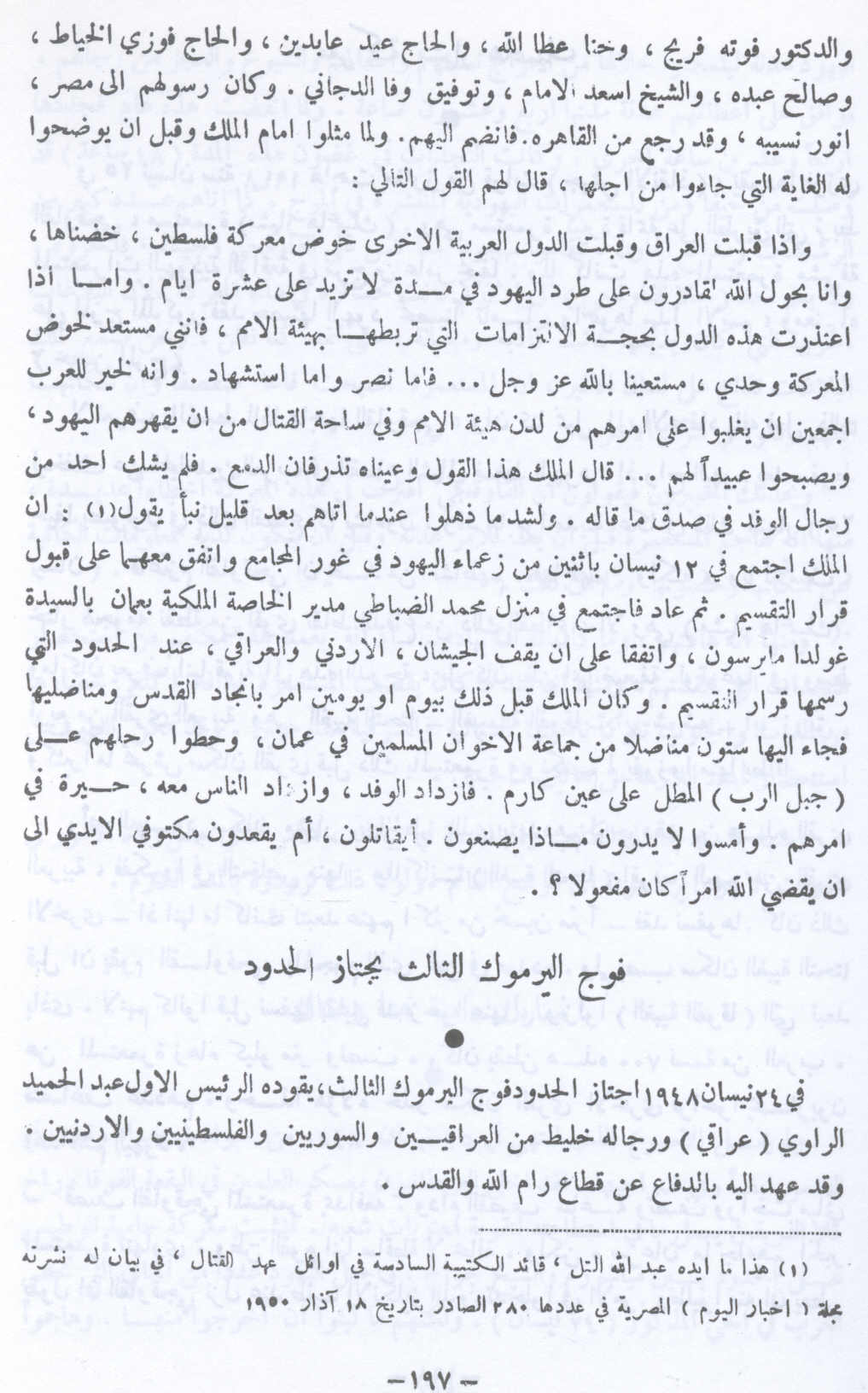 فوج اليرموك الثالث يجتاز الحدود - 24 نيسان 1948 (أسفل الصفحة) -- النكبة الفلسطينية والفردوس المفقود للأستاذ عارف العارف |