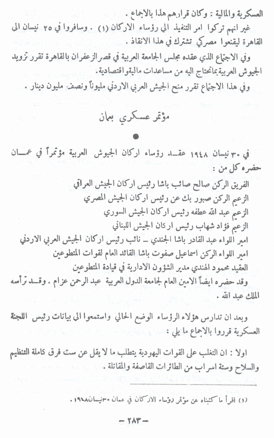 مؤتمر عسكري بعمان - 30 نيسان 1948 -- النكبة الفلسطينية والفردوس المفقود للأستاذ عارف العارف |