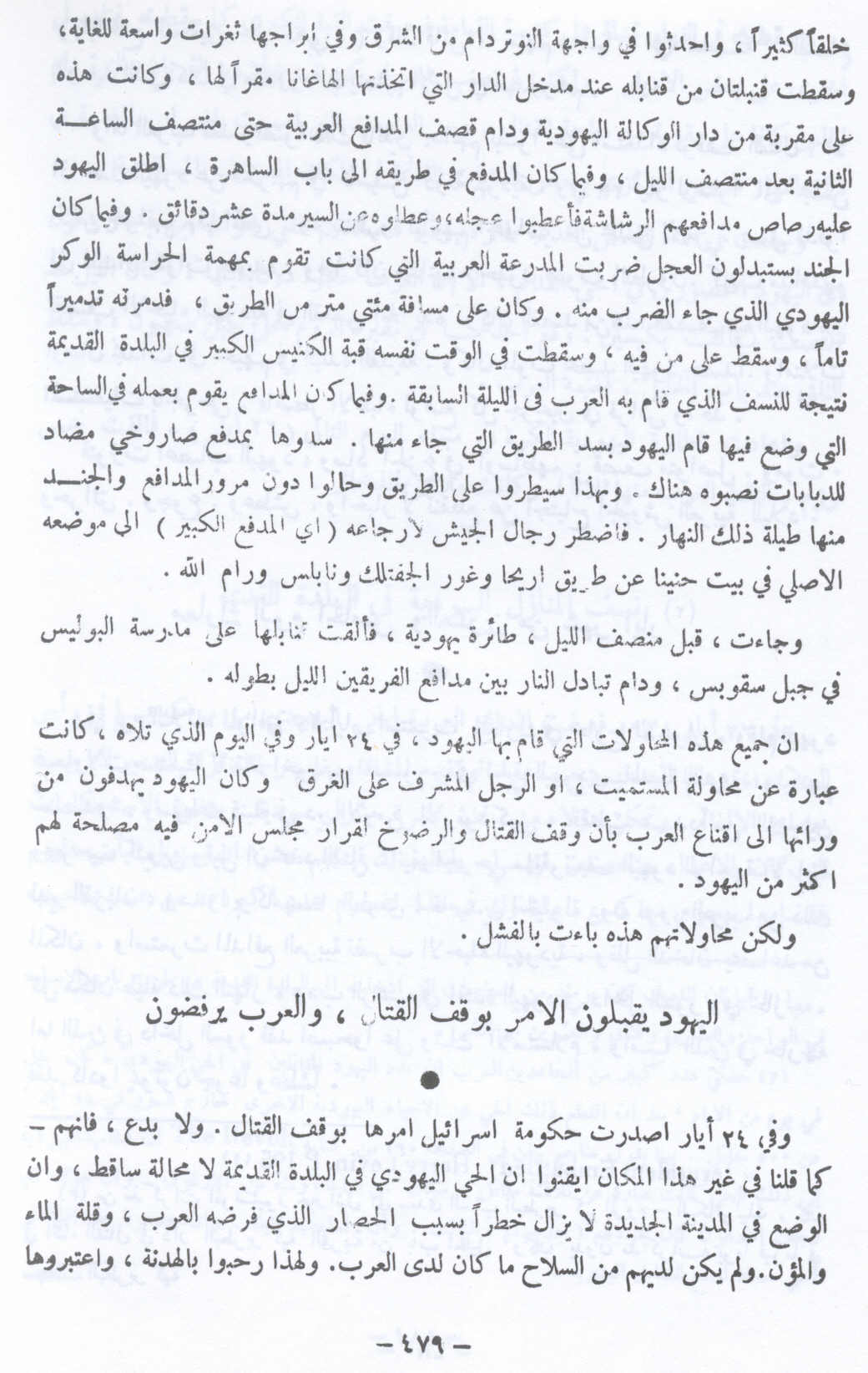 اليهود يقبلون الأمر بوقف القتال، والعرب يرفضون - 24 أيار 1948 -- النكبة الفلسطينية والفردوس المفقود للأستاذ عارف العارف |