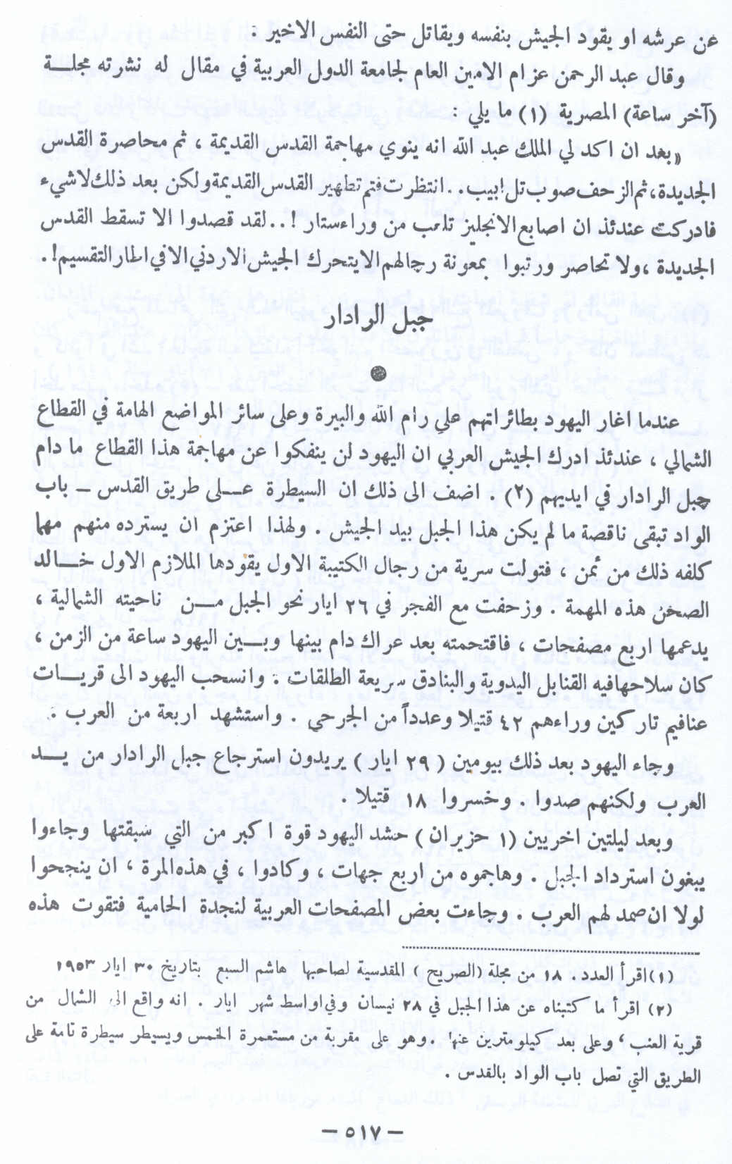 إسترداد جبل الرادار (أسفل الصفحة) - 29 أيار 1948 -- النكبة الفلسطينية والفردوس المفقود للأستاذ عارف العارف |