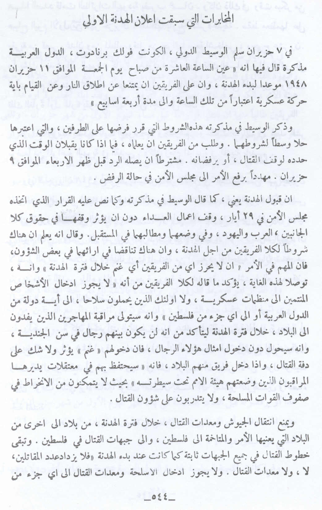 المخابرات التي سبقت إعلان الهدنة الأولى - 7 حزيران 1948 -- النكبة الفلسطينية والفردوس المفقود للأستاذ عارف العارف |