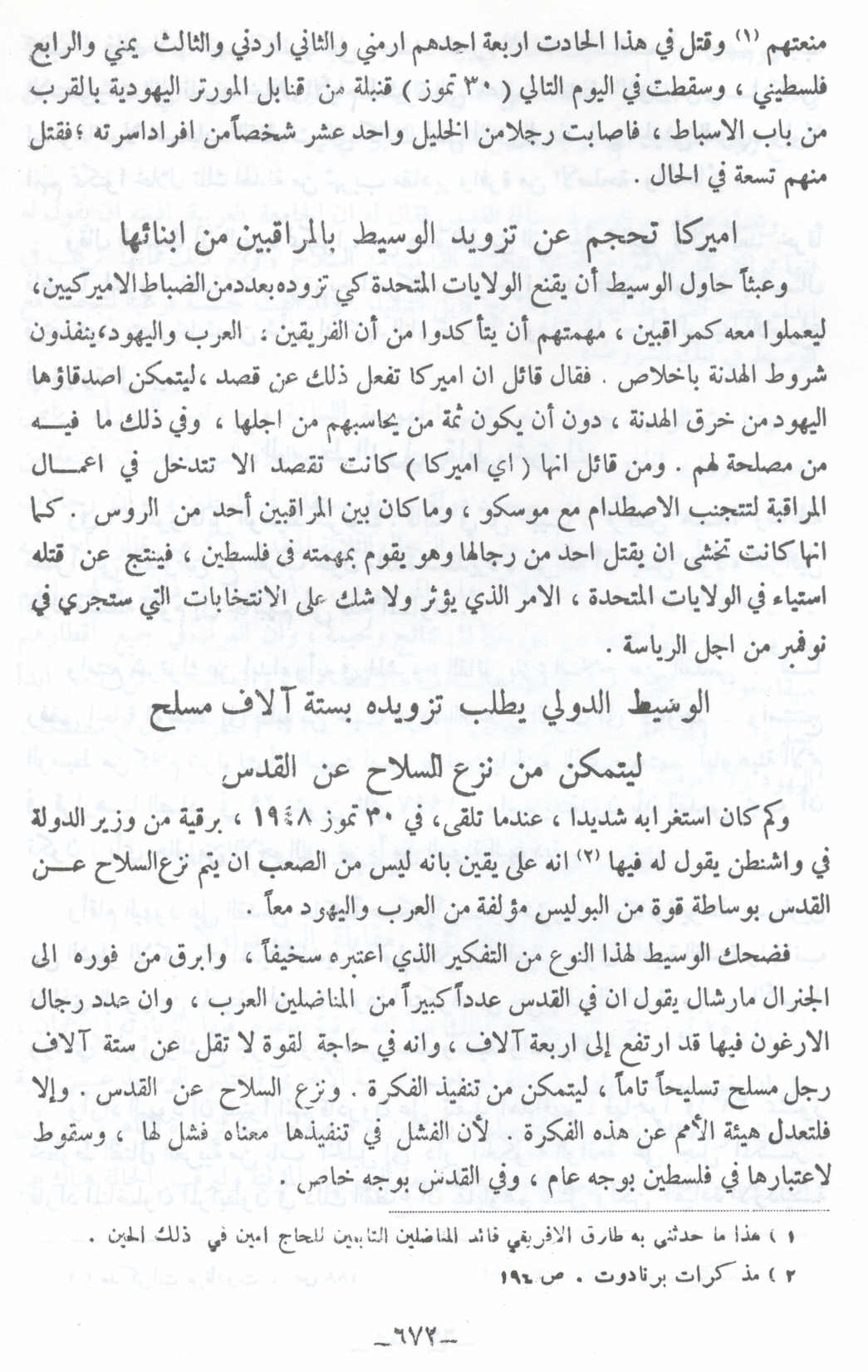الوسيط الدولي يطلب تزويده بستة آلاف مسلح ليتمكن من نزع السلاح عن القدس - 30 تموز 1948 -- النكبة الفلسطينية والفردوس المفقود للأستاذ عارف العارف |