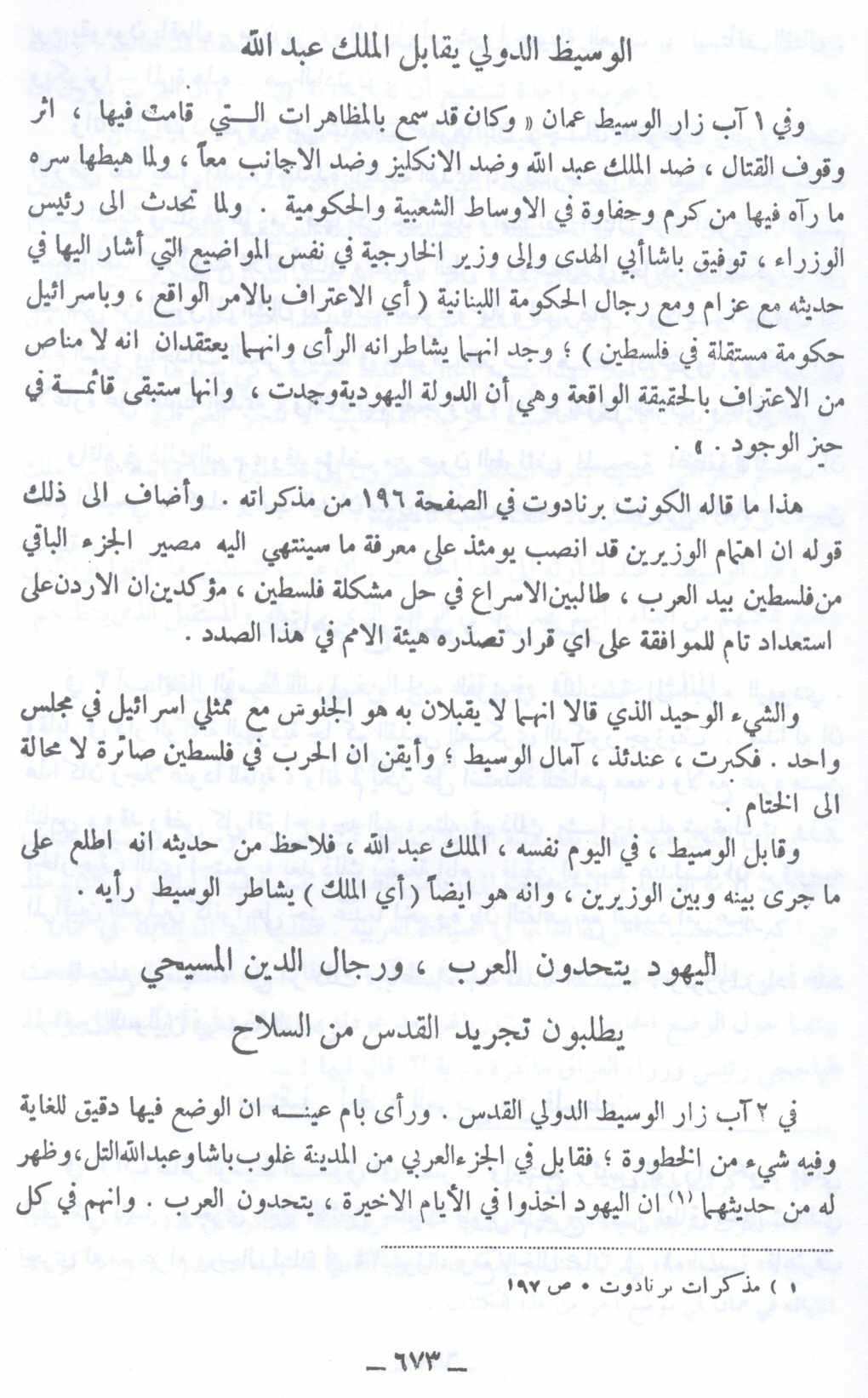 الوسيط الدولي يقابل الملك عبد الله - 1 آب 1948 -اليهود يتحدون العرب، ورجال الدين المسيحيين يطلبون تجريد القدس من السلاح - النكبة الفلسطينية والفردوس المفقود للأستاذ عارف العارف |