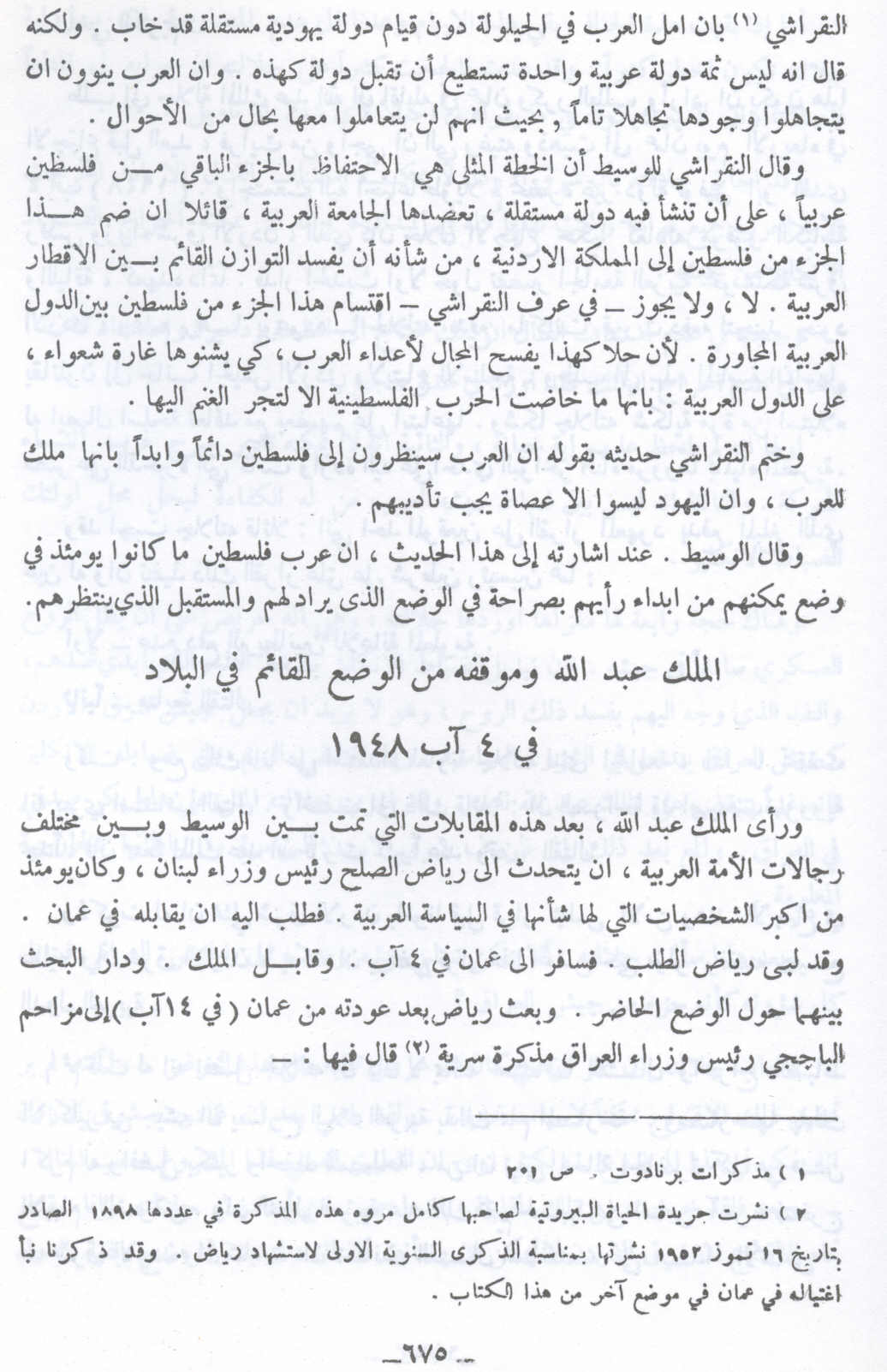 الملك عبد الله وموقفه من الوضع القائم في البلاد (أسفل الصفحة) - 4 آب 1948 -- النكبة الفلسطينية والفردوس المفقود للأستاذ عارف العارف |