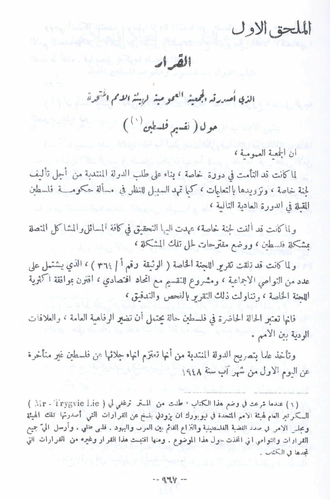 الملحق الأول: القرار أصدرته الجمعية العمومية لهيئة الأمم المتحدة حول (تقسيم فلسطين) -- النكبة الفلسطينية والفردوس المفقود للأستاذ عارف العارف |