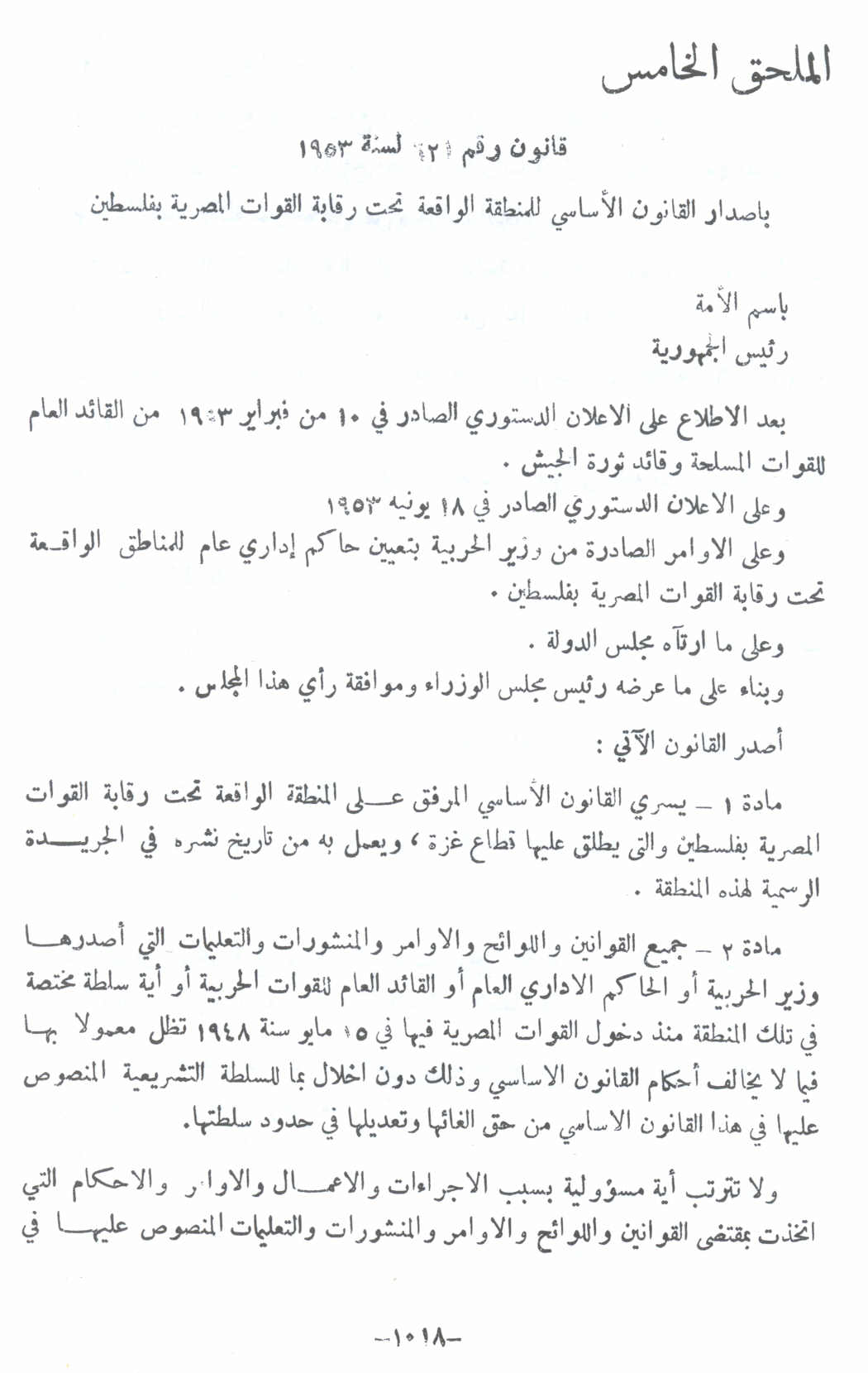 الملحق الخامس: القانون الأساسي للمنطقة الواقعة تحت رقابة القوات المصرية بفلسطين -- النكبة الفلسطينية والفردوس المفقود للأستاذ عارف العارف |