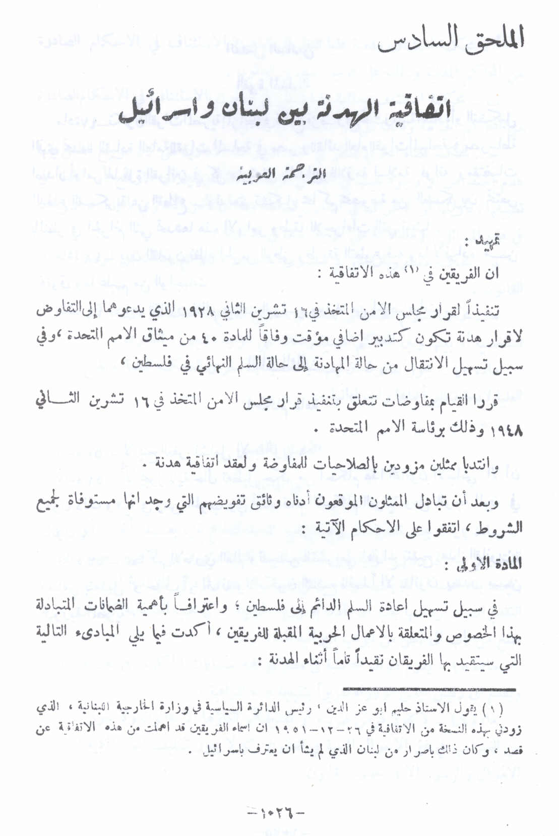 الملحق السادس: إتفاق الهدنة بين لبنان وإسرائيل -- النكبة الفلسطينية والفردوس المفقود للأستاذ عارف العارف |