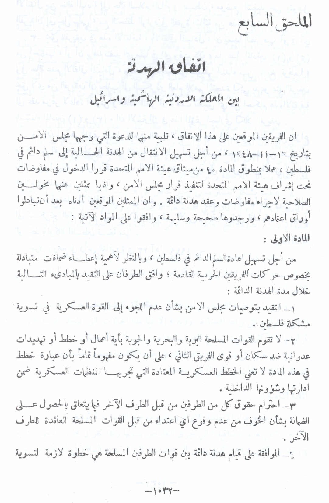 الملحق السابع: إتفاق الهدنة بين المملكة الأردنية الهاشمية وإسرائيل -- النكبة الفلسطينية والفردوس المفقود للأستاذ عارف العارف |