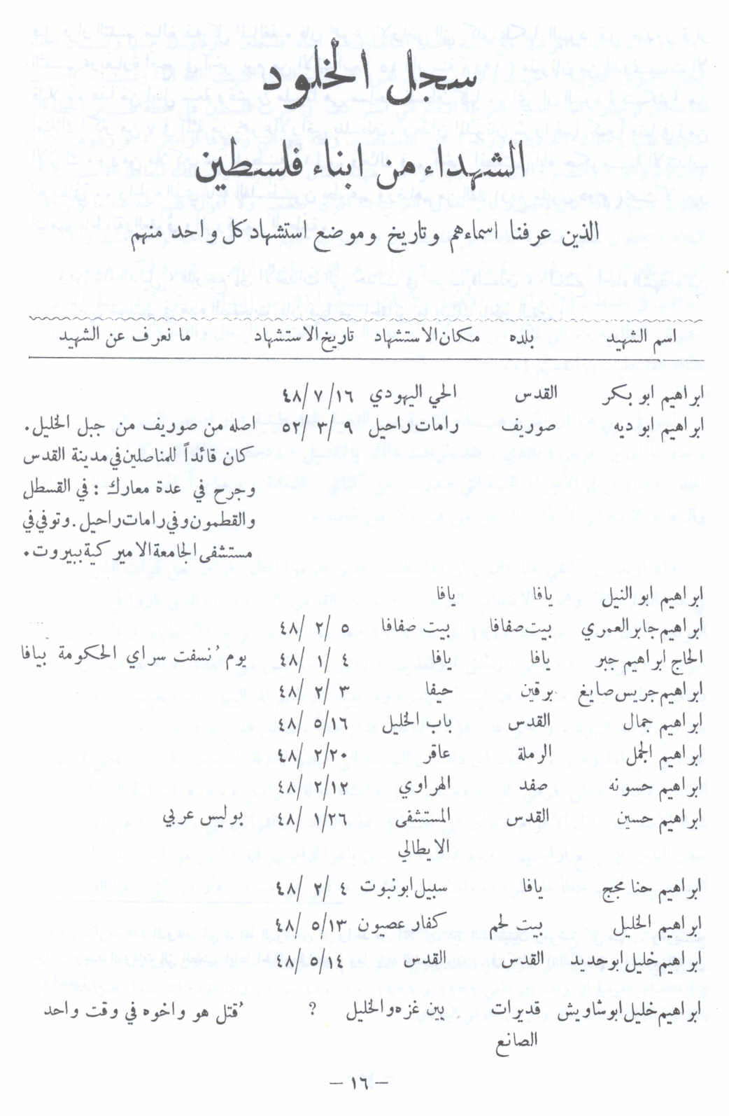 (أ) سجل الخلود: الشهداء من أبناء فلسطين الذين عرفنا أسماءهم وتاريخ وموضع إستشهاد كل واحد منهم -- النكبة الفلسطينية والفردوس المفقود للأستاذ عارف العارف |