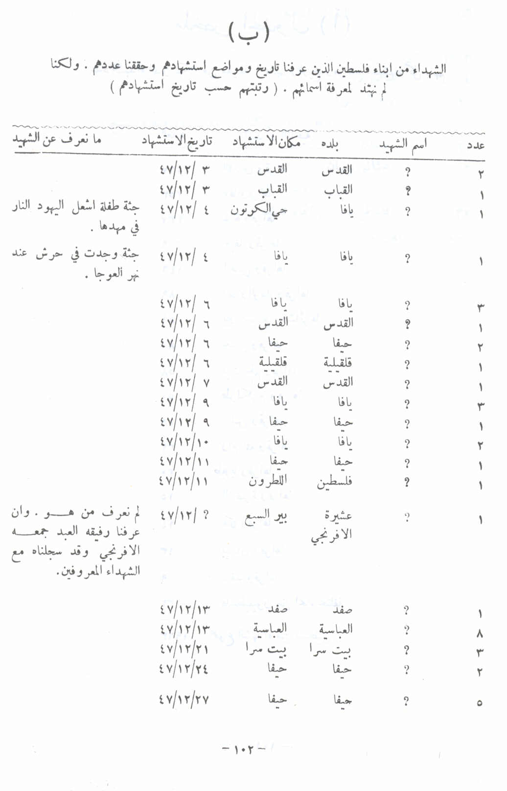 (ب) سجل الخلود: الشهداء من أبناء فلسطين الذين عرفنا تاريخ ومواضع إستشهادهم وحققنا عددهم. ولكننا لم نهتد لمعرفة أسمائهم. (رتبتهم حسب تاريخ إستشهادهم) -- النكبة الفلسطينية والفردوس المفقود للأستاذ عارف العارف |