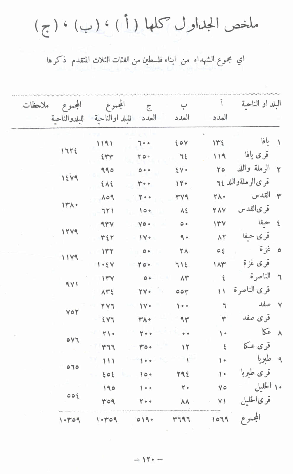 ملخص الجداول كلها (أ)، (ب)، (ج) -- النكبة الفلسطينية والفردوس المفقود للأستاذ عارف العارف |