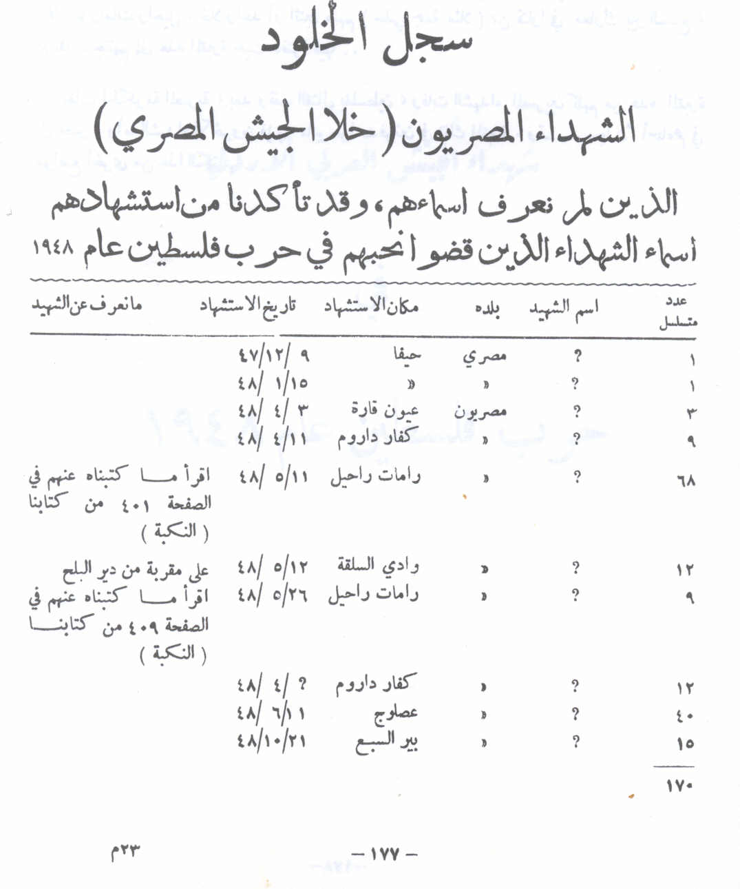 أسماء الشهداء المصريون (خلا الجيش المصري) الذين لم نعرف أسماءهم وقد تأكدنا من إستشهادهم -- النكبة الفلسطينية والفردوس المفقود للأستاذ عارف العارف |