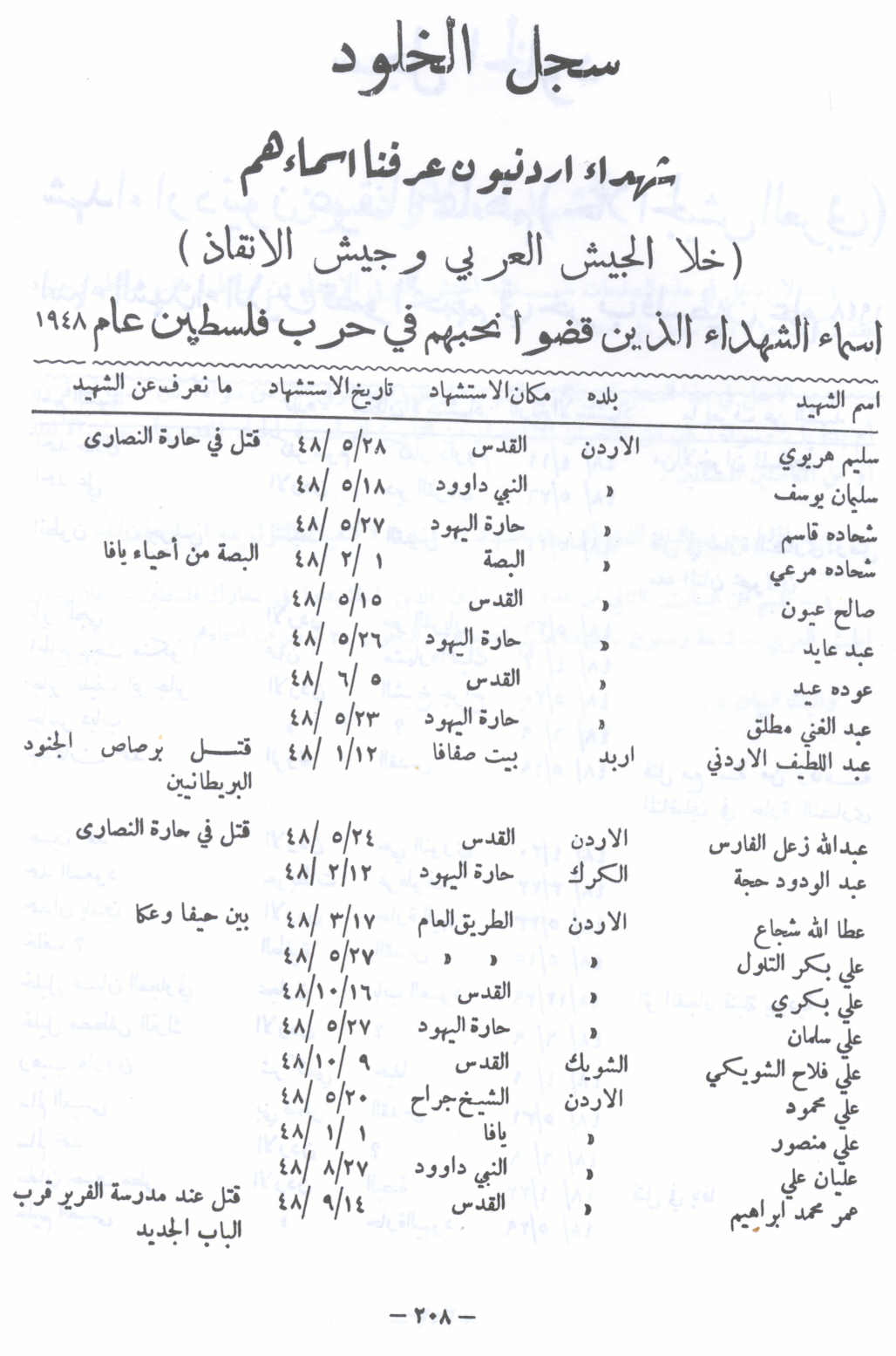 أسماء الشهداء الأردنيين (خلا رجال الجيش العربي الأردني وجيش الإنقاظ) الذين عرفنا أسماءهم -- النكبة الفلسطينية والفردوس المفقود للأستاذ عارف العارف |