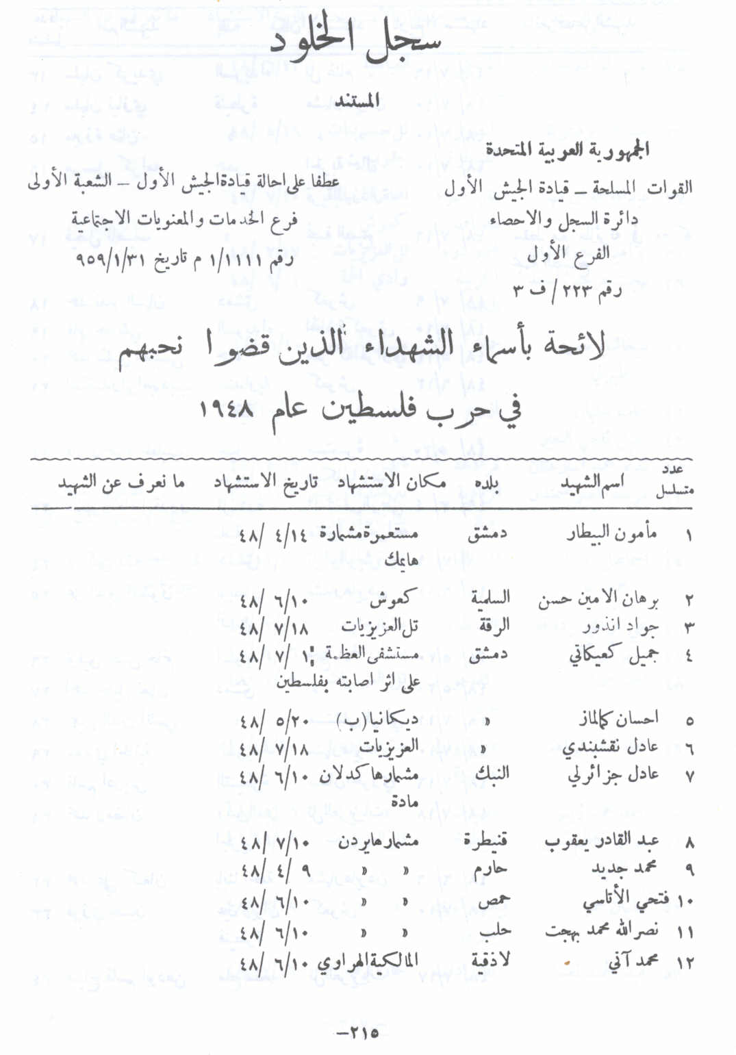 أسماء شهداء الجيش السوري الذين قضوا نحبهم في حرب فلسطين عام 1948 -- النكبة الفلسطينية والفردوس المفقود للأستاذ عارف العارف |