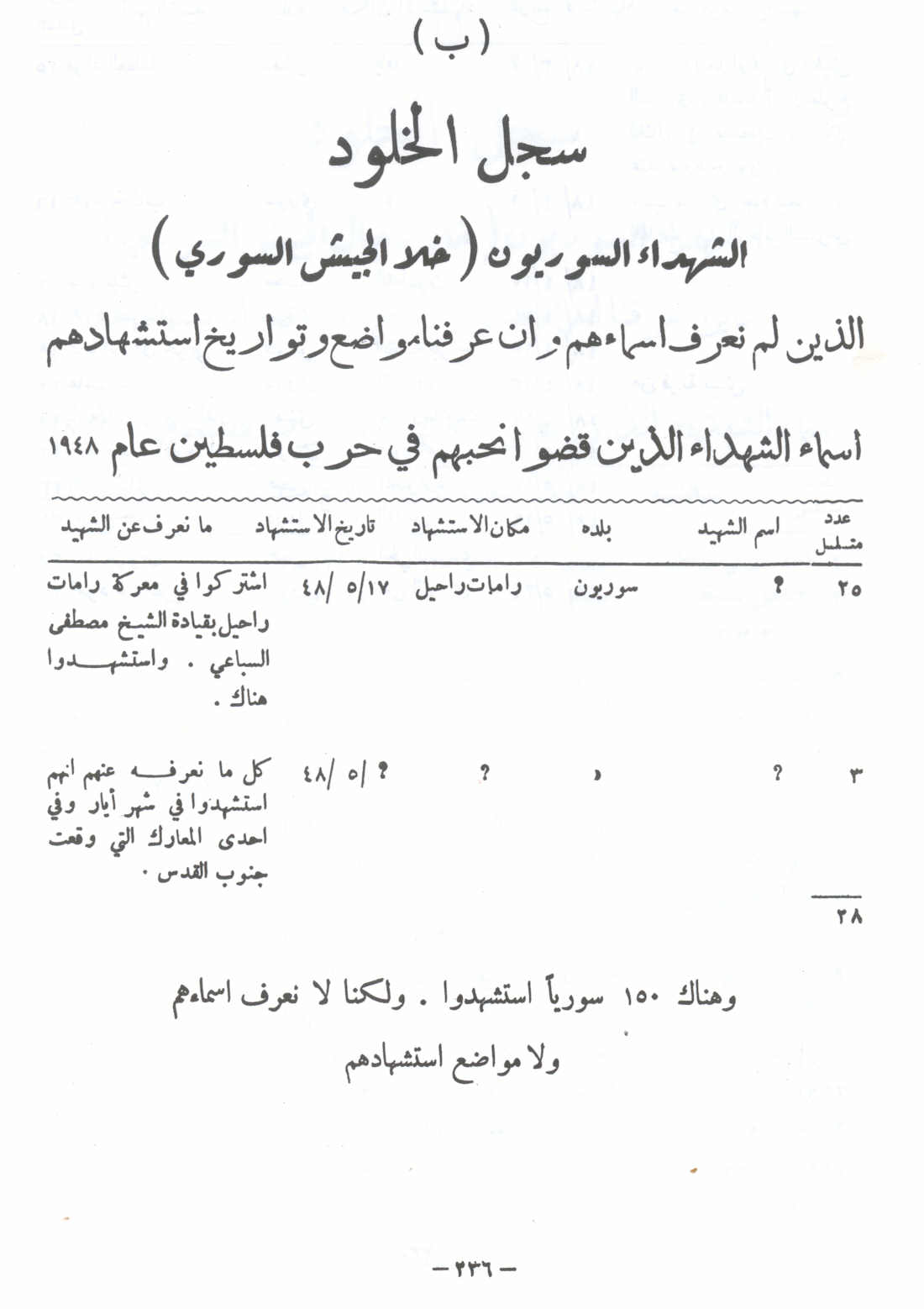 الشهداء السوريون (خلا رجال الجيش السوري) الذين لم نعرف أسماءهم وإن عرفنا مواضع وتواريخ إستشهادهم -- النكبة الفلسطينية والفردوس المفقود للأستاذ عارف العارف |