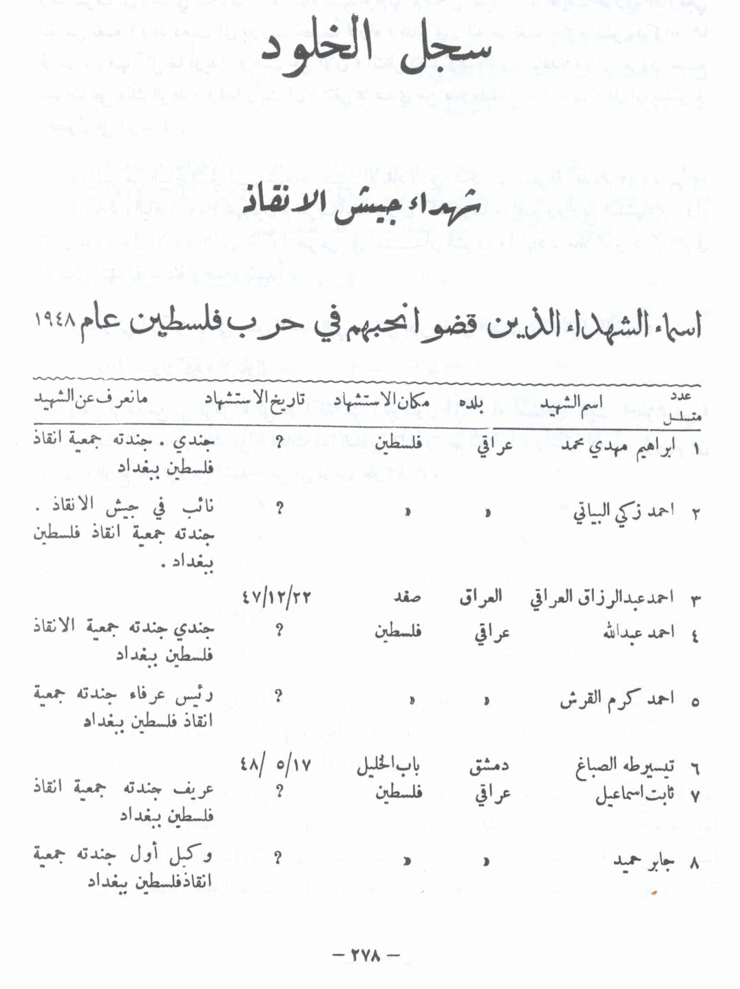 أسماء شهداء الجيش الإنقاظ الذين قضوا نحبهم في حرب فلسطين عام 1948 -- النكبة الفلسطينية والفردوس المفقود للأستاذ عارف العارف |