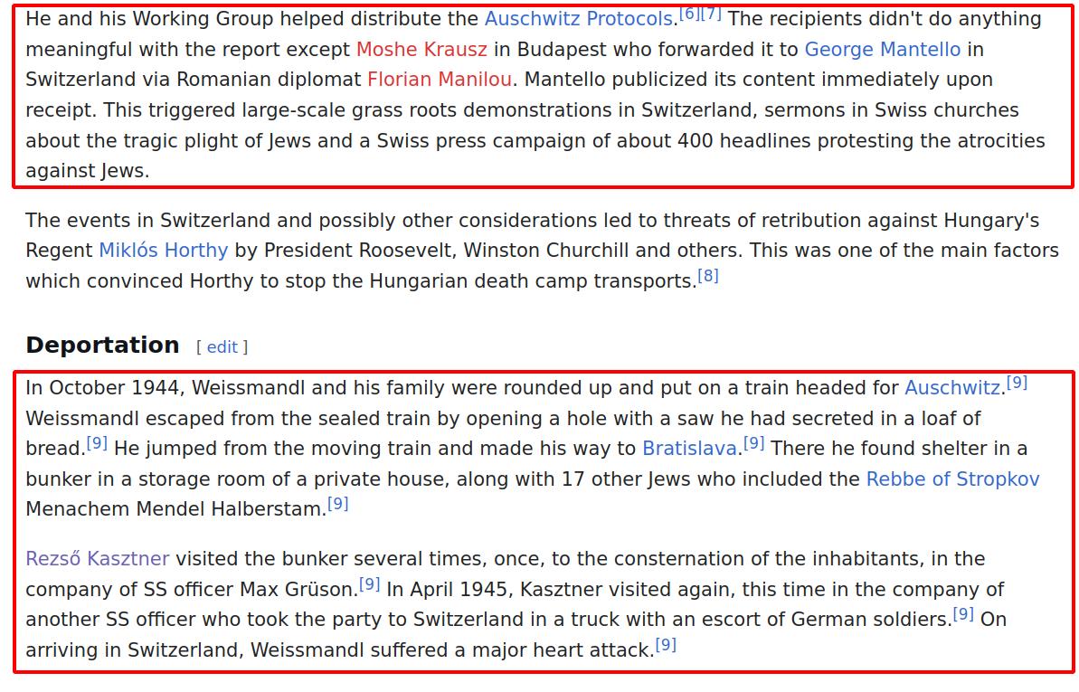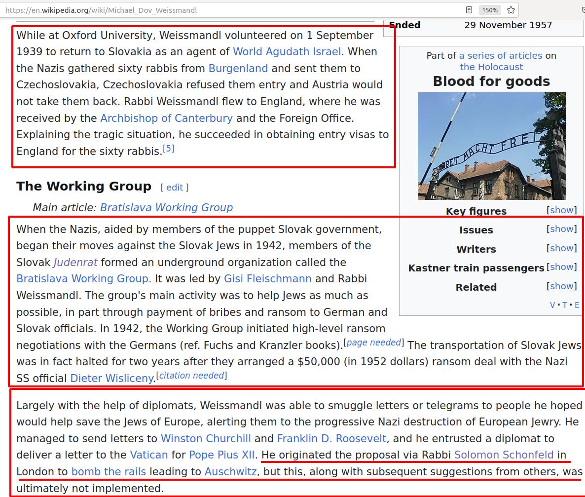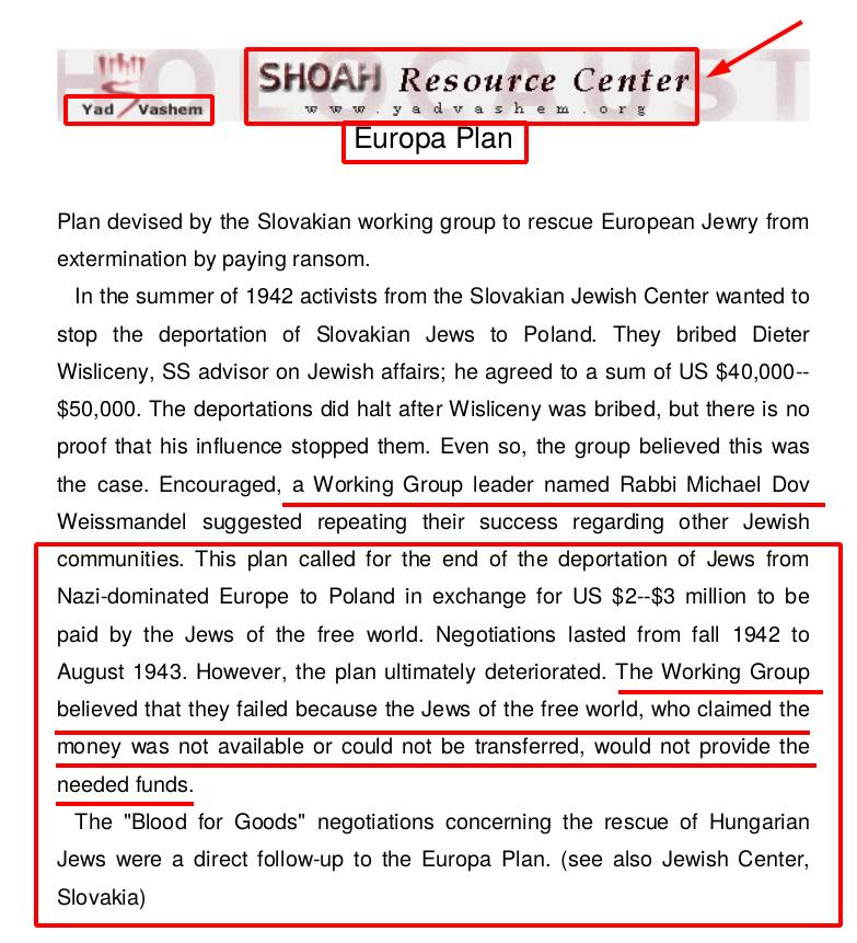 Based on our research, starting from the summer of 1942, it is safe to say that Nazis were interested in making deals (for unknown reasons, perhaps Nazis were pressed for cash) that could have saved Jews in return for paying a relatively small ransom (either in cash payment or by providing materials like trucks, food provisions, ..etc.). The Slovakian Working Groups attempted to delay the shipment of the Slovakian Jews to Auschwitz by paying a small ransom of $50,000. Once that was successful and trust was built between the Working Group and Heinrich Himmler's deputy (e.g.., Dieter_Wisliceny), the Group recognized the potential of a much larger deal, which aimed to save much of the European Jewish community that was still alive (in a deal best known as The Europea Plan). Still, sadly, Jewish communities worldwide (especially those in the US and Palestine) didn't seem to take the offer seriously. This was true in the case of the Jewish Agency, which kept dithering and dragging its feet until the clock ran out (see the case of Joel Brand for details). As far as we can tell, there was no successful deal whatsoever. The account of Rabbi Michael Dov Weissmandl of what happened was heart-wrenching; he paid dearly for exposing Zionists' reasons during WWII (the same thing happened to Hanna Arendt when she exposed the KAPO files). Rabbi Weismandel is one of the true unsung heroes humanity has ever known, who lost much of his family in the Holocaust and escaped from a moving train on his way to be killed in Auschwitz. Rabbi Weismandel was instrumental in writing the Auschwitz Protocols and for lobbying to bomb the death camps. Stay tuned; we shall be enriching this section soon: