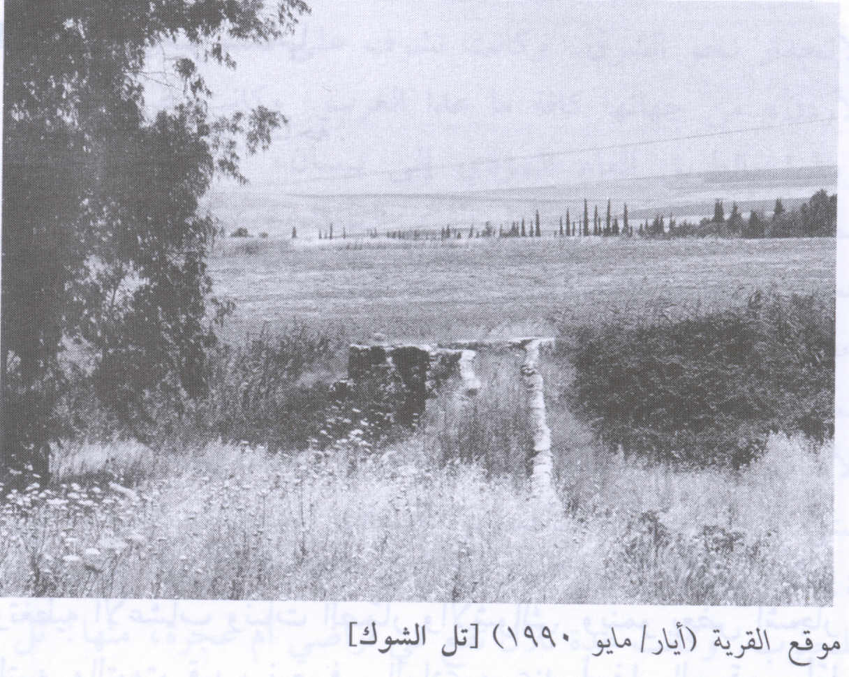 Village Before NakbaThe village was situated between the Jamma'in River (on the north) and Wadi al-Jawsaq (on the south), on flat terrain that sloped gradually towards the northeast, near the foot of the al-Faqqu'a Mountains (also known as the Jilbu' Hills). The spring of Ayn al-Jawsaq flowed 0.5 km south of the site, and a dam equipped with a water-powered mill stood about 0.2 km to the west. Tall al-Shawk was linked directly to Baysan by a secondary road; dirt paths connected it to neighboring villages. It had a rectangular plan. Its inhabitants were Muslims. In 1944/45 a total of 33 dunums of what was left of village land was allocated to cereals; 14 dunums were irrigated or used for orchards. As its name suggested, the village was built on a mound in which traces of earlier buildings were visible. The nearby Tall al-Shaykh Humud (192211) had granite columns on its surface.Israeli Settlements on Village Lands Zionists Colonies on Village LandsThere are no Israeli settlements on village lands.Village TodayNo traces of the village remain. The site itself is covered with weeds and thorns and is traversed by a man-made canal. Two large eucalyptus trees can be seen on the site. The land around Wadi al-Jawsaq is cultivated by the settlement of Nir David, which was established in 1936, on the nearby lands of al-Sakhina.SourceDr. Walid al-Khalidi, 1992: All That Remains. |