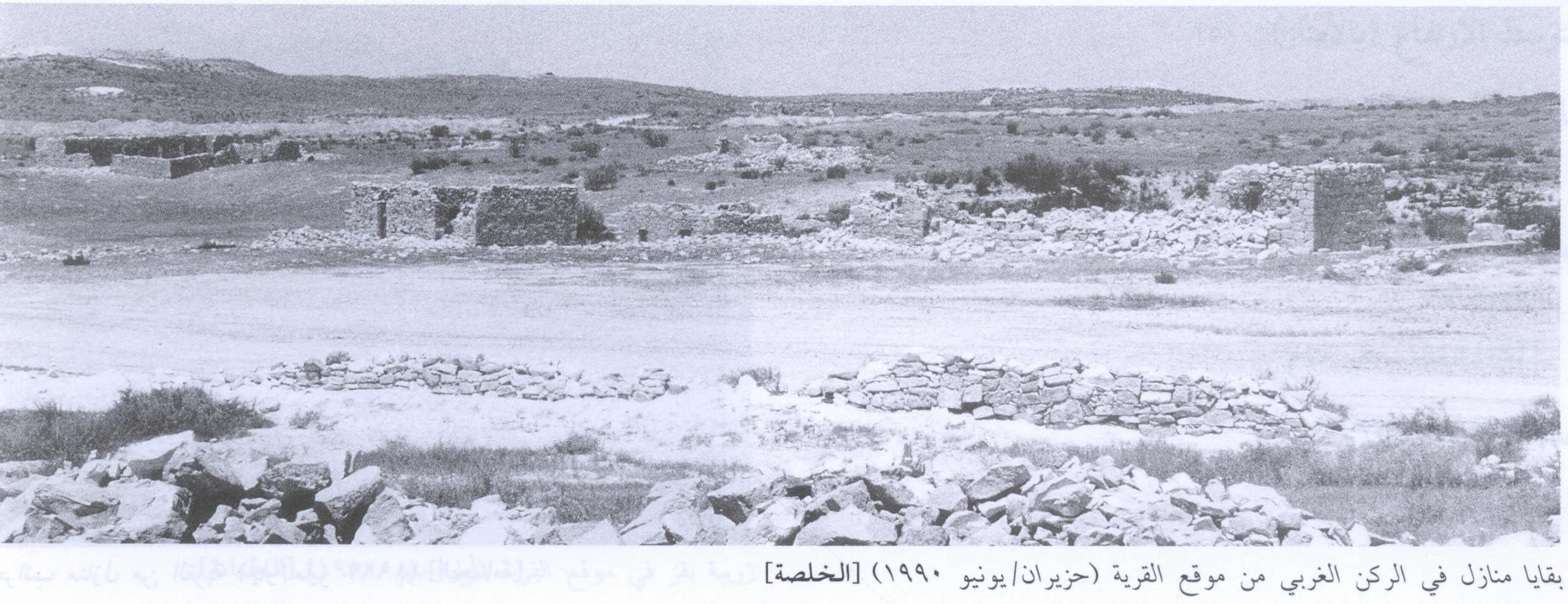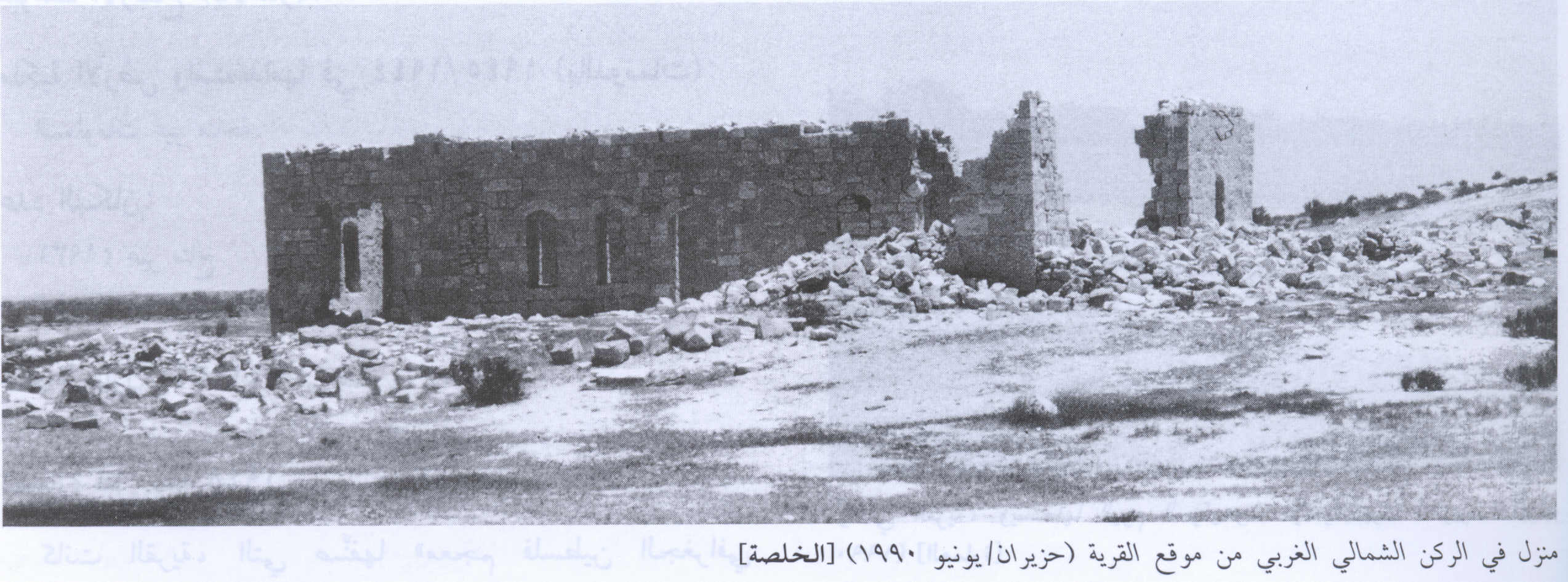 Village TodayAccording to the Palestinian historian Walid Khalidi, the village remaining structures on the village land are:"Some of the village houses are still standing but are deserted and partially destroyed. To the west of the village site is a well that is still functional, with a round mouth and metal ladder. A large house with a rectangular outline and eight rooms stands several meters away, to the west of the well. Behind it one can see the rubble of ten destroyed houses." |