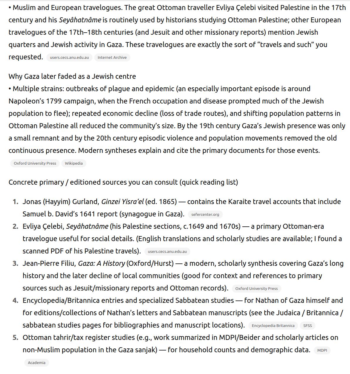 • I can locate/compile a short packet of primary excerpts for you: Samuel ben David’s Gaza notes (from Ginzei Yisra’el), Evliya Çelebi’s passages about Gaza, selections from European travelogues (Thévenot, Maundrell, Jesuit reports), plus the modern secondary works that cite the Ottoman registers. Tell me whether you prefer English translations or the original Hebrew/Arabic/French texts and I’ll pull the best available online editions and bibliographic details. Would you like me to assemble those primary excerpts and bibliographic references into a single file (PDF or annotated list)?